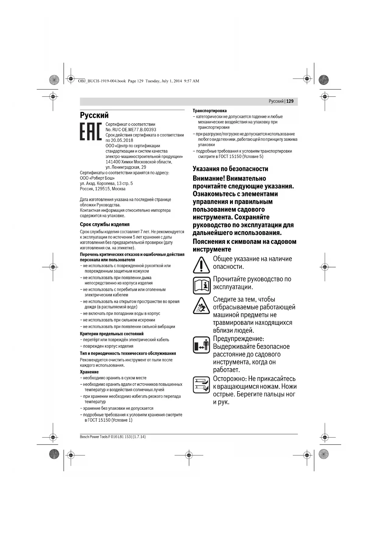OBJ_BUCH-1919-004.book Page 129 Tuesday, July 1, 2014 9:57 AM130 | Русский F 016 L81 153 | (1.7.14) Bosch Power Tools Неприменимо. Выключайте садовый инструмент и вытаскивайте штепсельную вилку из розетки перед изменением настроек на садовом инструменте или его очисткой, если запутался шнур или если Вам нужно оставить садовый инструмент без присмотра даже на короткое время. Держите шнур питания на расстоянии от ножей. Прежде чем прикасаться к деталям садового инструмента, подождите, пока все его детали полностью не остановятся. Ножи продолжают вращаться некоторое время после выключения садового инструмента и могут причинить телесные повреждения. Не используйте садовый инструмент в дождь и не подвергайте его воздействию