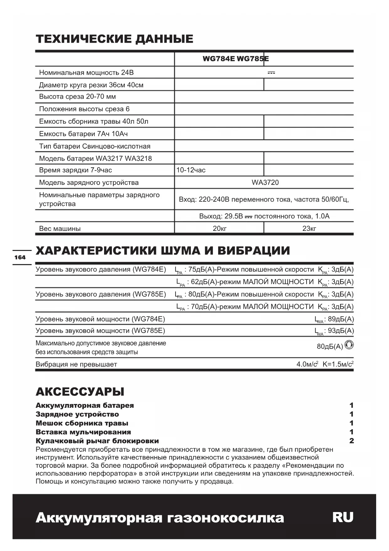 : 3дБ(А) Уровень звуковой мощности (WG784E) L