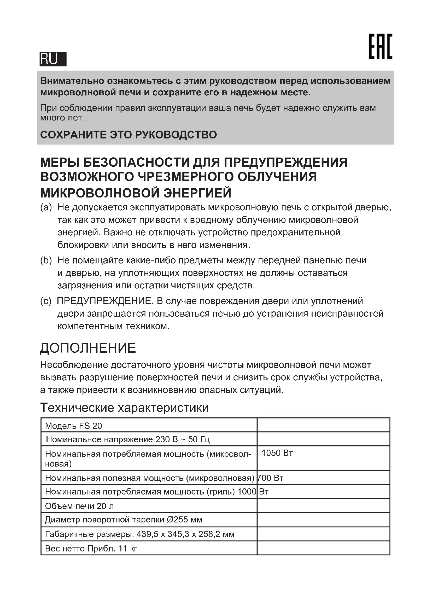Несоблюдение достаточного уровня чистоты микроволновой печи может вызвать разрушение поверхностей печи и снизить срок службы устройства, а также привести к возникновению опасных ситуаций. Технические характеристики новая)1050 ВтНоминальная полезная мощность (микроволновая) 700 ВтНоминальная потребляемая мощность (гриль) 1000 ВтОбъем печи 20 лДиаметр поворотной тарелки Ø255 ммГабаритные размеры: 439,5 x 345,3 x 258,2 ммВес нетто Прибл. 11 кгМодель FS 20 Номинальное напряжение 230 В ~ 50 ГцНоминальная потребляемая мощность (микровол-ОСНОВНЫЕ ПРАВИЛА ТЕХНИКИ БЕЗОПАСНОСТИ ПРЕДУПРЕЖДЕНИЕ Необходимо предпринимать приведенные ниже основные меры предосторожности для снижения опасности пожаров, ударов электрическим током, травм пользователей и облучения микроволновой энергией при пользовании микроволновой печью.