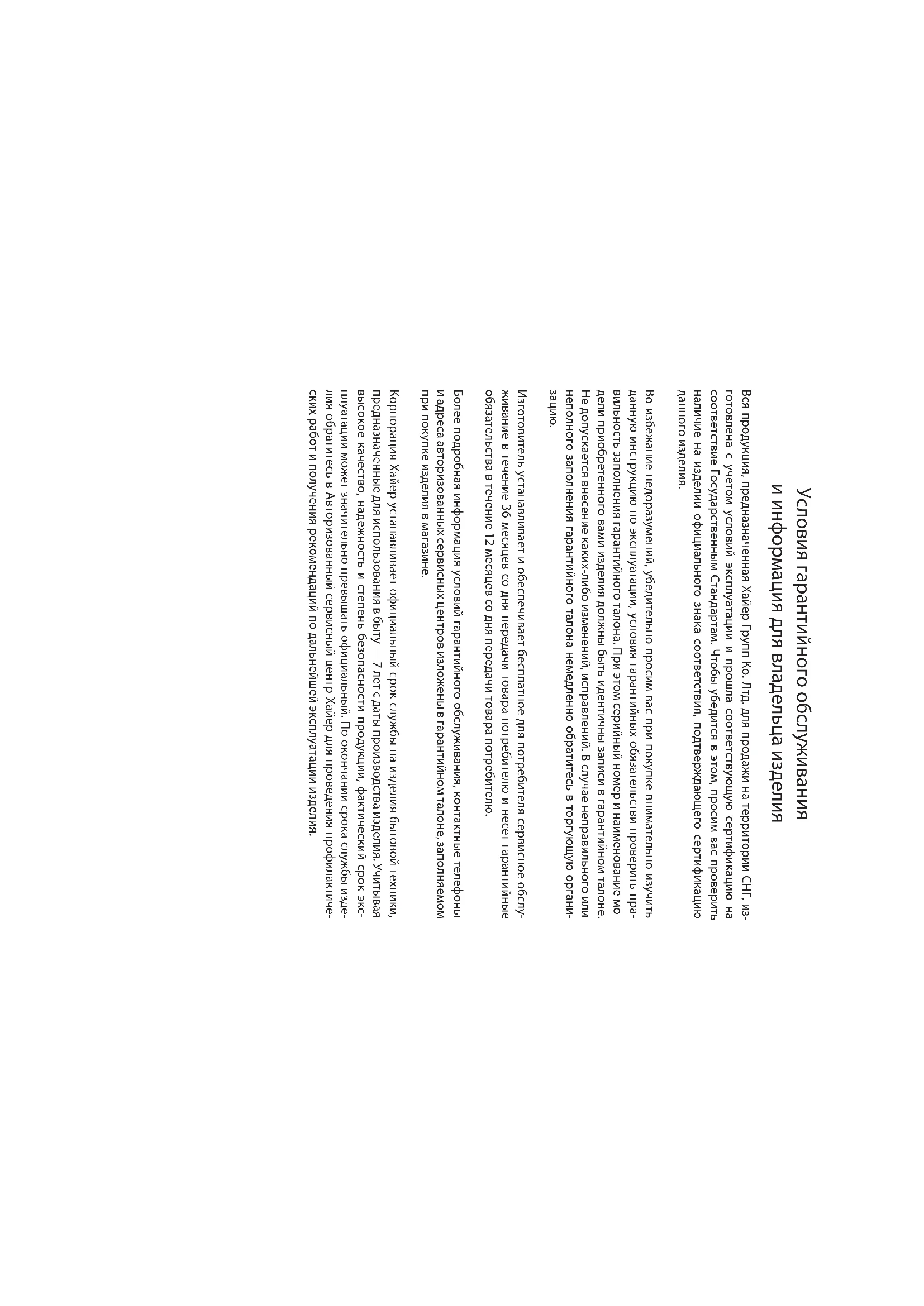 Изготовитель устанавливает и обеспечивает бесплатное для потребителя сервисное обслу- живание в течение 36 месяцев со дня передачи товара потребителю и несет гарантийные обязательства в течение 12 месяцев со дня передачи товара потребителю. Более подробная информация условий гарантийного обслуживания, контактные телефоны и адреса авторизованных сервисных центров изложены в гарантийном талоне, заполняемом при покупке изделия в магазине. Корпорация Хайер устанавливает официальный срок службы на изделия бытовой техники, предназначенные для использования в быту — 7 лет с даты производства изделия. Учитывая высокое качество, надежность и степень безопасности продукции, фактический срок экс- плуатации может значительно превышать официальный. По окончании срока службы изде- лия обратитесь в Авторизованный сервисный центр Хайер для проведения профилактиче- ских работ и получения рекомендаций по дальнейшей эксплуатации изделия.3