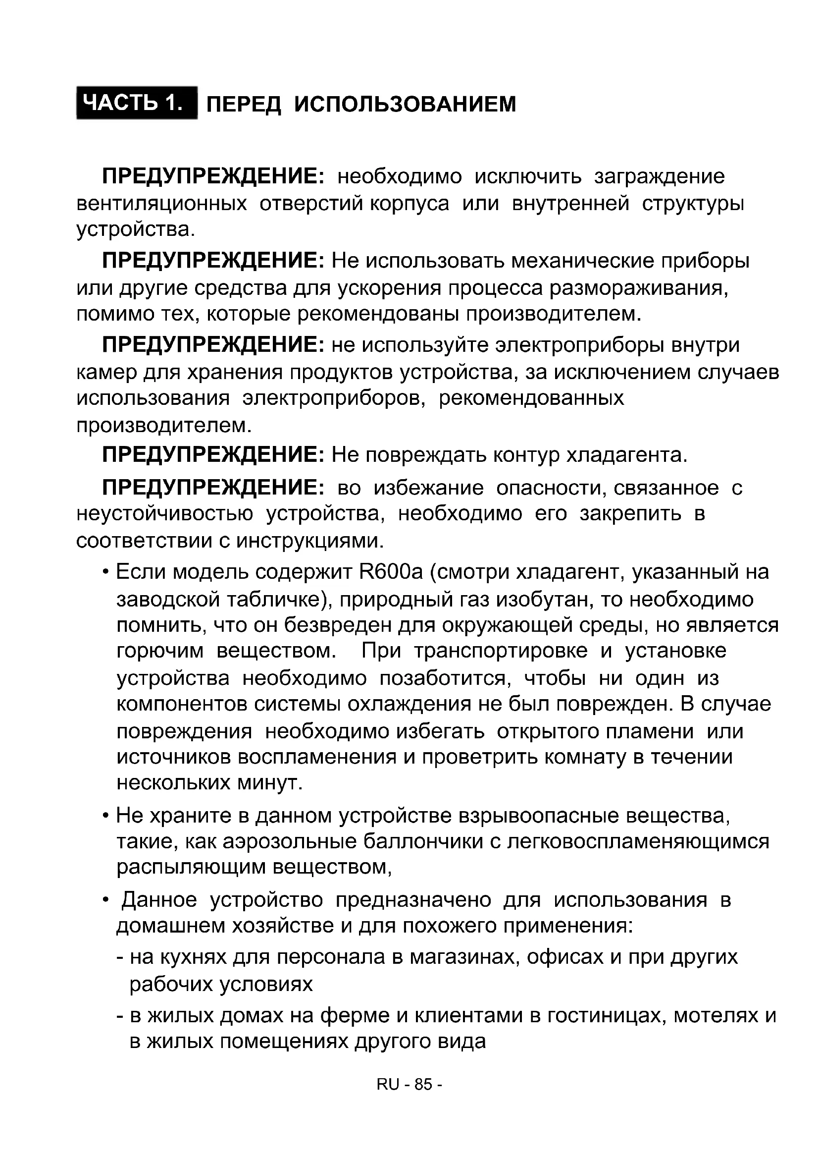 - ДЕТАЛИ И ОТДЕЛЕНИЯ ПРИБОРА RU - 85 - ПРЕДУПРЕЖДЕНИЕ: необходимо исключить заграждение вентиляционных отверстий корпуса или внутренней структуры устройства. ПРЕДУПРЕЖДЕНИЕ: Не использовать механические приборы или другие средства для ускорения процесса размораживания, помимо тех, которые рекомендованы производителем. ПРЕДУПРЕЖДЕНИЕ: не используйте электроприборы внутри камер для хранения продуктов устройства, за исключением случаев использования электроприборов, рекомендованных производителем. ПРЕДУПРЕЖДЕНИЕ: Не повреждать контур хладагента. ПРЕДУПРЕЖДЕНИЕ: во избежание опасности, связанное с неустойчивостью устройства, необходимо его закрепить в соответствии с инструкциями. p. 98
