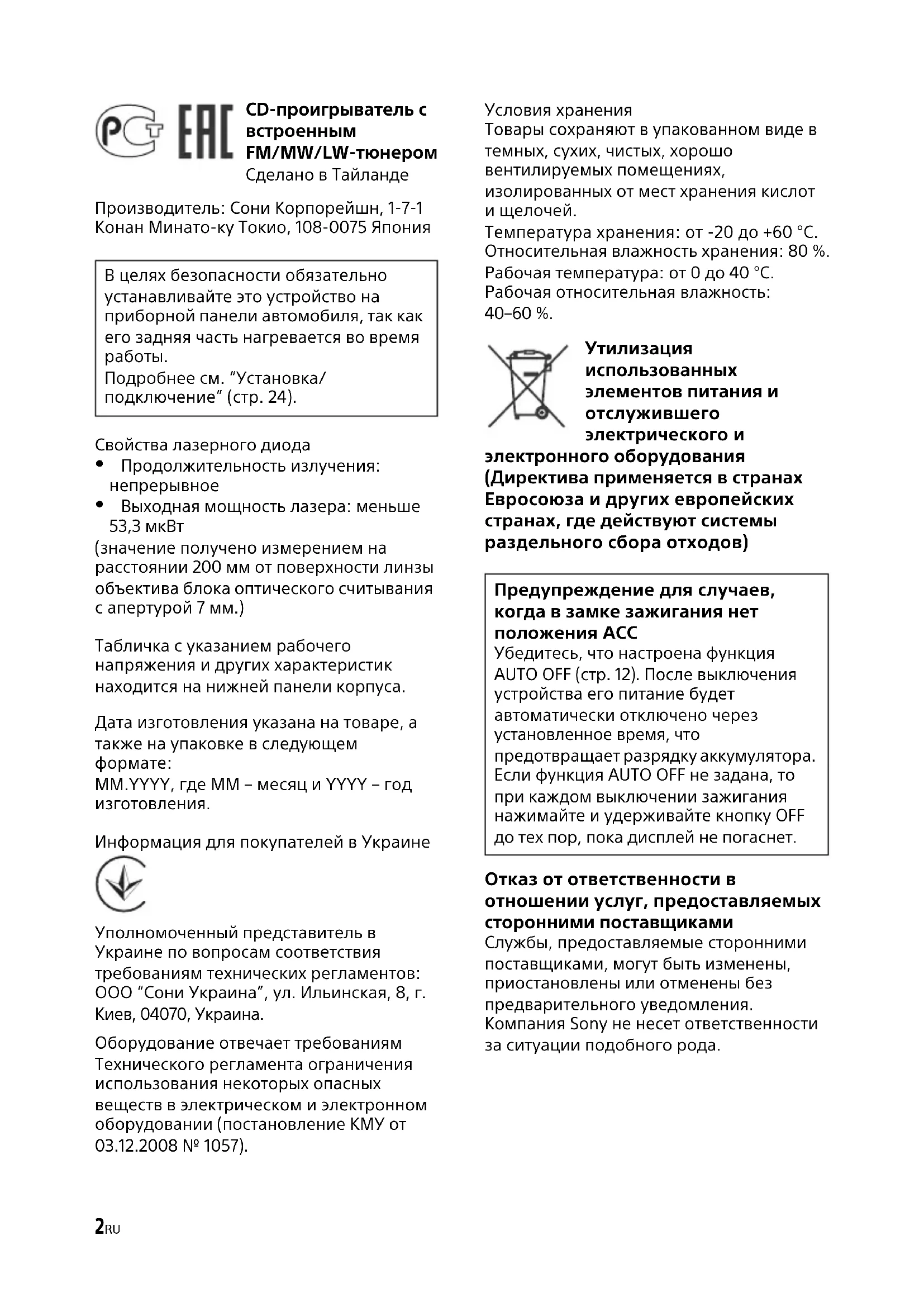 MM.YYYY, где MM – месяц и YYYY – год изготовления. Информация для покупателей в Украине Уполномоченный представитель в Украине по вопросам соответствия требованиям технических регламентов: ООО “Сони Украина”, ул. Ильинская, 8, г. Киев, 04070, Украина. Оборудование отвечает требованиям Технического регламента ограничения использования некоторых опасных веществ в электрическом и электронном оборудовании (постановление КМУ от