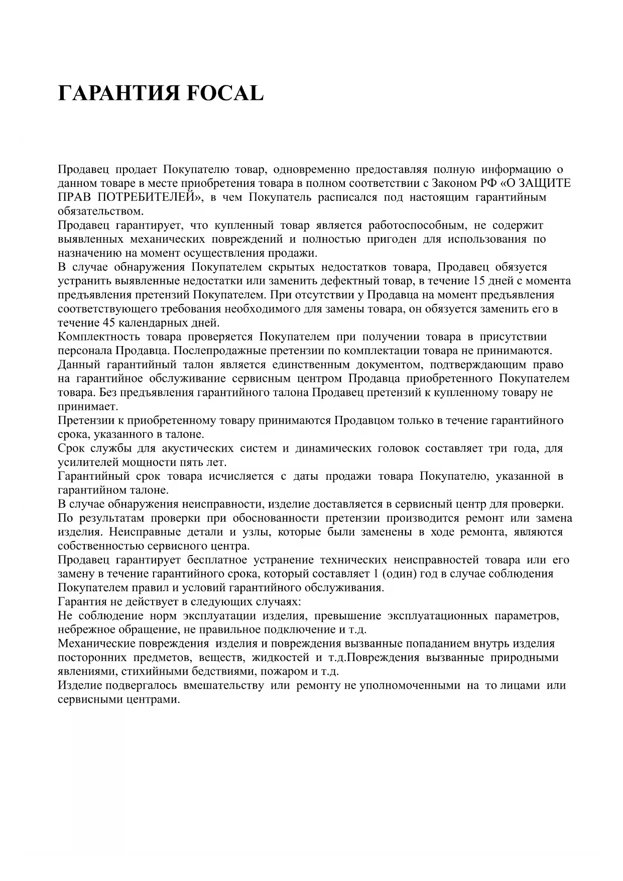 Teie Focal-JMlab toode on välja töötatud ning toodetud kõrgkvaliteetsest materjalist ning osades, mida on võimalik ümber töödelda ning/või korduvkasutada. Antud märgis näitab, et elektri- ja elektroonikaseadmeid peab nende kasutusaja lõppemisel kõrvaldama lahus muudest jäätmetest. Palun viige toode kõrvaldamiseks teie kohalikku jäätmete kogumiskohta või antud seadme ümbertöötamiskeskusesse. See aitab kaitsta meid ümbritsevat keskkonda.Продавец продает Покупателю товар, одновременно предоставляя полную информацию о данном товаре в месте приобретения товара в полном соответствии с Законом РФ «О ЗАЩИТЕ ПРАВ ПОТРЕБИТЕЛЕЙ», в чем Покупатель расписался под настоящим гарантийным обязательством. Продавец гарантирует, что купленный товар является работоспособным, не содержит выявленных механических повреждений и полностью пригоден для использования по назначению на момент осуществления продажи. В случае обнаружения Покупателем скрытых недостатков товара, Продавец обязуется устранить выявленные недостатки или заменить дефектный товар, в течение 15 дней с момента предъявления претензий Покупателем. При отсутствии у Продавца на момент предъявления соответствующего требования необходимого для замены товара, он обязуется заменить его в течение 45 календарных дней. Комплектность товара проверяется Покупателем при получении товара в присутствии персонала Продавца. Послепродажные претензии по комплектации товара не принимаются. Данный гарантийный талон является единственным документом, подтверждающим право на гарантийное обслуживание сервисным центром Продавца приобретенного Покупателем товара. Без предъявления гарантийного талона Продавец претензий к купленному товару не