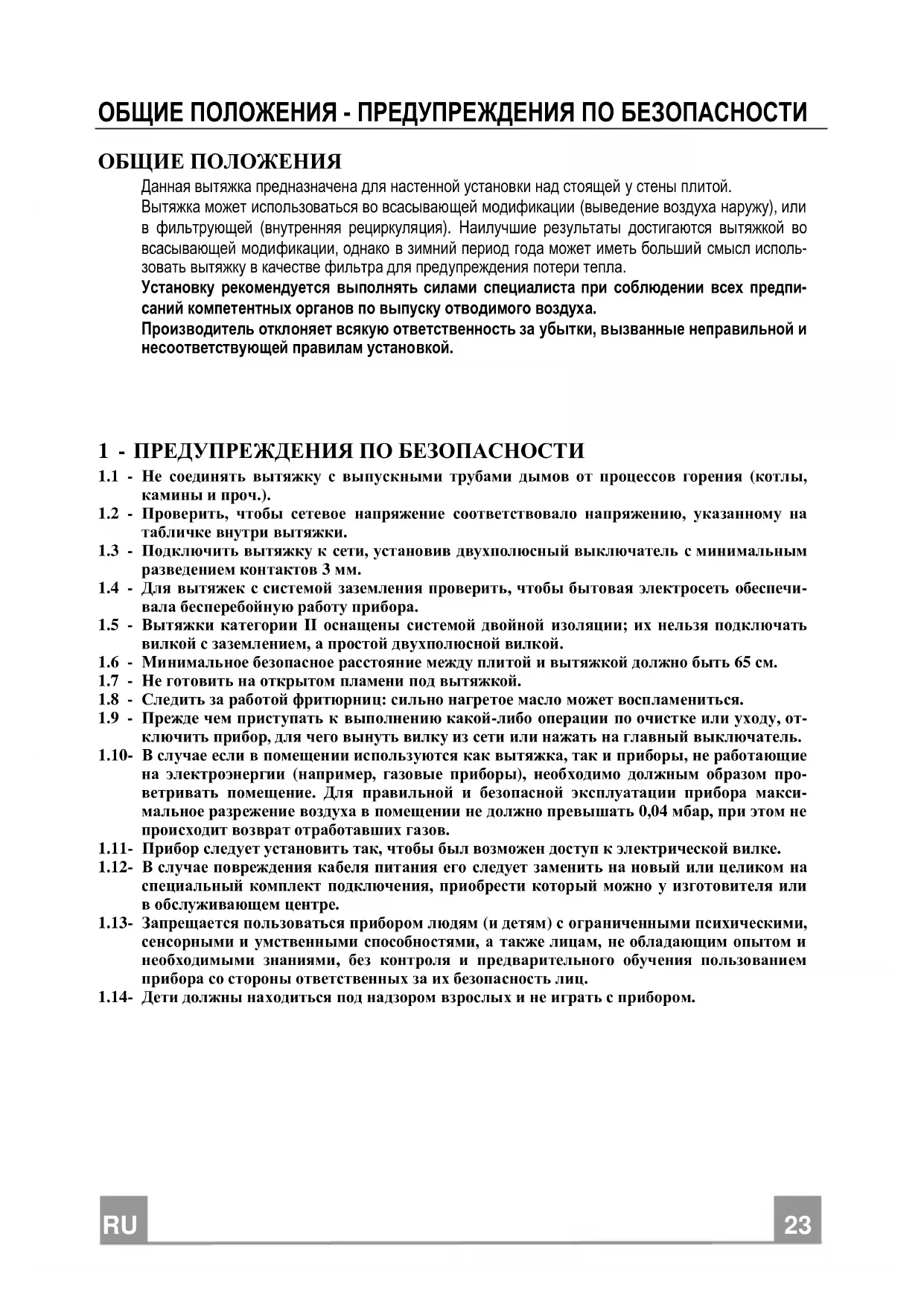 ключить прибор, для чего вынуть вилку из сети или нажать на главный выключатель. 1.10- В случае если в помещении используются как вытяжка, так и приборы, не работающие на электроэнергии (например, газовые приборы), необходимо должным образом про- ветривать помещение. Для правильной и безопасной эксплуатации прибора макси- мальное разрежение воздуха в помещении не должно превышать 0,04 мбар, при этом не происходит возврат отработавших газов. 1.11- Прибор следует установить так, чтобы был возможен доступ к электрической вилке. 1.12- В случае повреждения кабеля питания его следует заменить на новый или целиком на специальный комплект подключения, приобрести который можно у изготовителя или в обслуживающем центре. 1.13- Запрещается пользоваться прибором людям (и детям) с ограниченными психическими, сенсорными и умственными способностями, а также лицам, не обладающим опытом и необходимыми знаниями, без контроля и предварительного обучения пользованием прибора со стороны ответственных за их безопасность лиц. 1.14- Дети должны находиться под надзором взрослых и не играть с прибором.RU