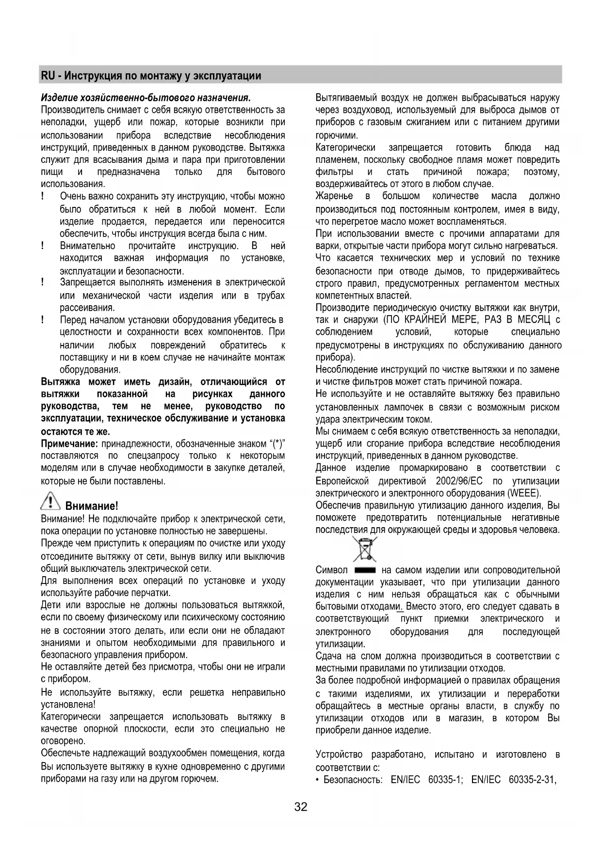 Несоблюдение инструкций по чистке вытяжки и по замене и чистке фильтров может стать причиной пожара. Не используйте и не оставляйте вытяжку без правильно установленных лампочек в связи с возможным риском удара электрическим током. Мы снимаем с себя всякую ответственность за неполадки, ущерб или сгорание прибора вследствие несоблюдения инструкций, приведенных в данном руководстве. Данное изделие промаркировано в соответствии с Европейской директивой 2002/96/EC по утилизации электрического и электронного оборудования (WEEE). Обеспечив правильную утилизацию данного изделия, Вы поможете предотвратить потенциальные негативные последствия для окружающей среды и здоровья человека.