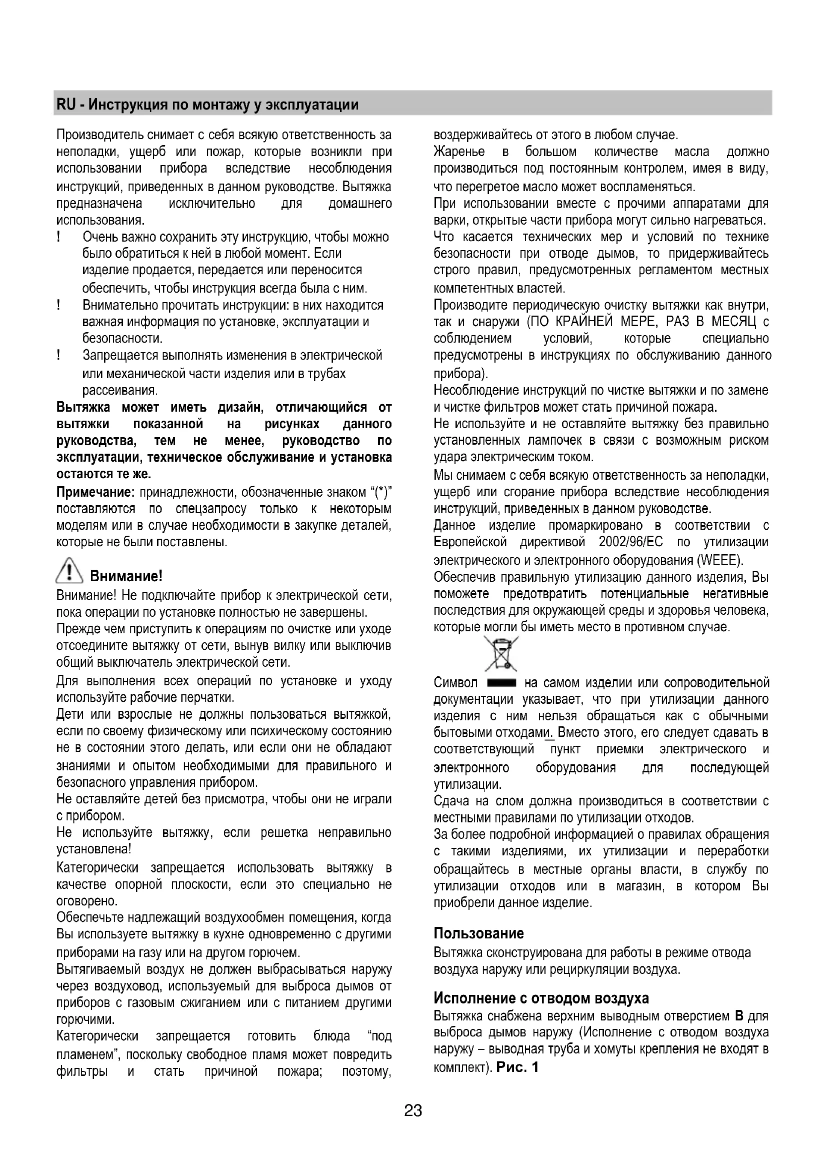 Несоблюдение инструкций по чистке вытяжки и по замене и чистке фильтров может стать причиной пожара. Не используйте и не оставляйте вытяжку без правильно установленных лампочек в связи с возможным риском удара электрическим током. Мы снимаем с себя всякую ответственность за неполадки, ущерб или сгорание прибора вследствие несоблюдения инструкций, приведенных в данном руководстве. Данное изделие промаркировано в соответствии с Европейской директивой 2002/96/EC по утилизации электрического и электронного оборудования (WEEE). Обеспечив правильную утилизацию данного изделия, Вы поможете предотвратить потенциальные негативные последствия для окружающей среды и здоровья человека, которые могли бы иметь место в противном случае.