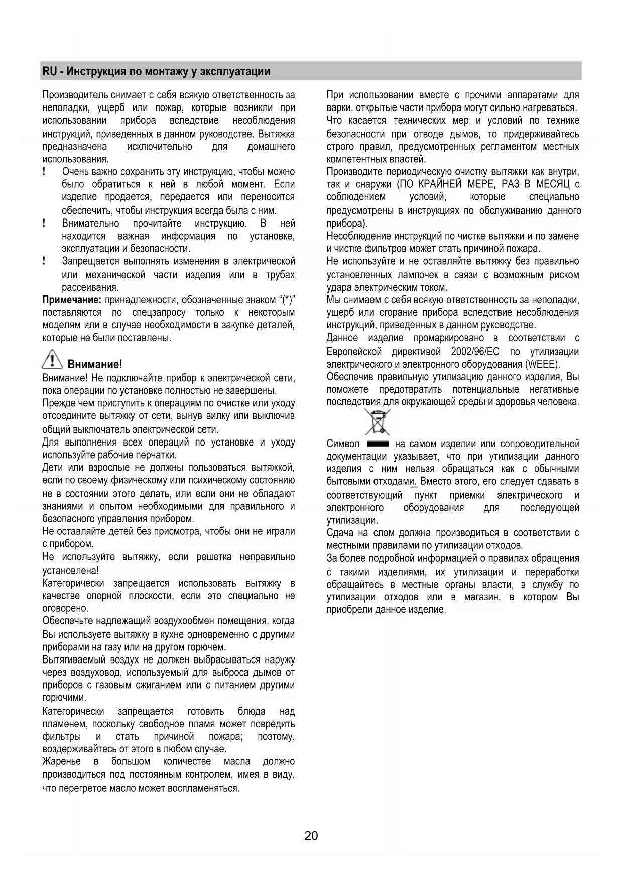 Производитель снимает с себя всякую ответственность за неполадки, ущерб или пожар, которые возникли при использовании прибора вследствие несоблюдения инструкций, приведенных в данном руководстве. Вытяжка предназначена исключительно для домашнего использования.