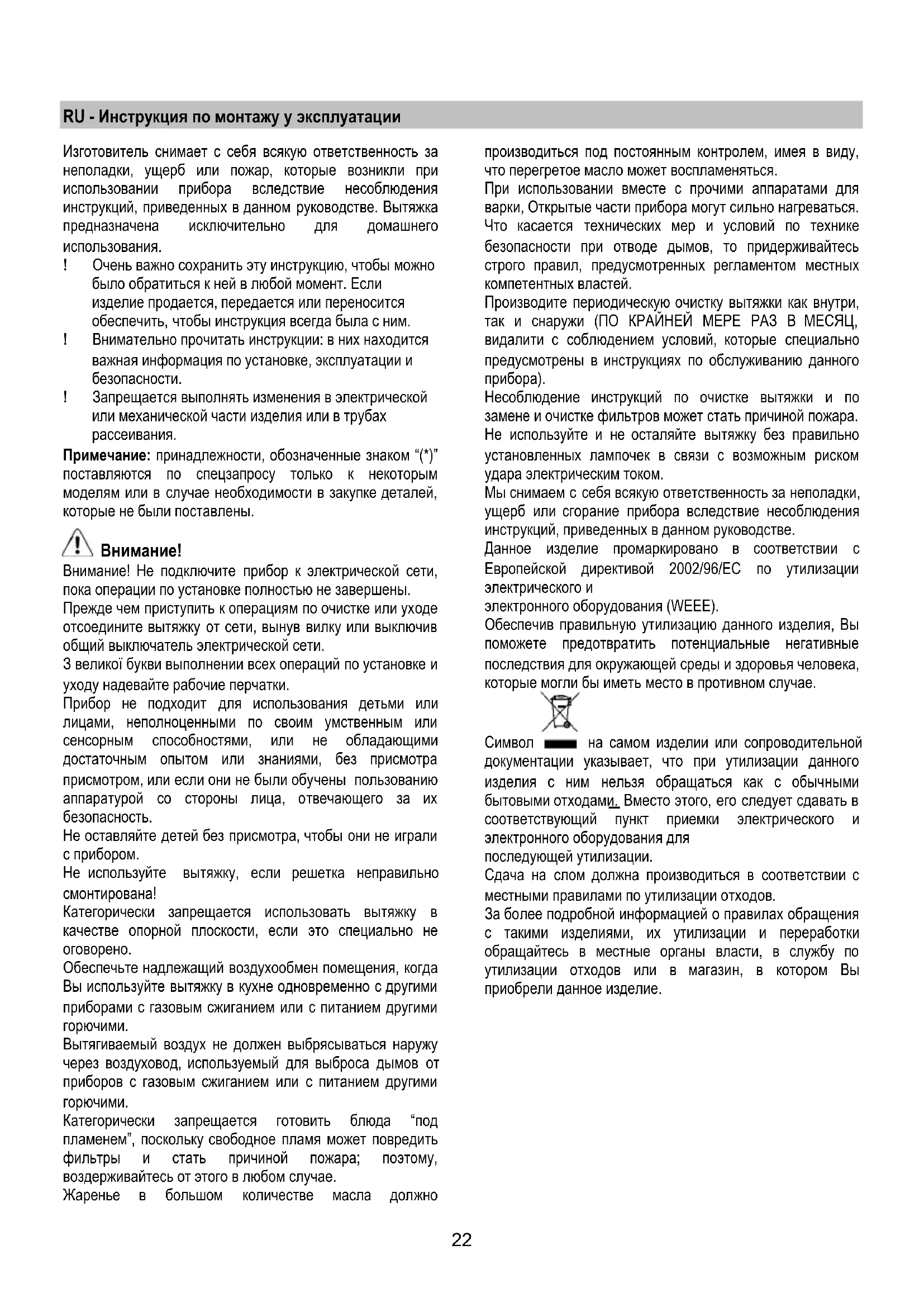 Несоблюдение инструкций по очистке вытяжки и по замене и очистке фильтров может стать причиной пожара. Не используйте и не осталяйте вытяжку без правильно установленных лампочек в связи с возможным риском удара электрическим током. Мы снимаем с себя всякую ответственность за неполадки, ущерб или сгорание прибора вследствие несоблюдения инструкций, приведенных в данном руководстве. Данное изделие промаркировано в соответствии с Европейской директивой 2002/96/EC по утилизации электрического и электронного оборудования (WEEE). Обеспечив правильную утилизацию данного изделия, Вы поможете предотвратить потенциальные негативные последствия для окружающей среды и здоровья человека, которые могли бы иметь место в противном случае.