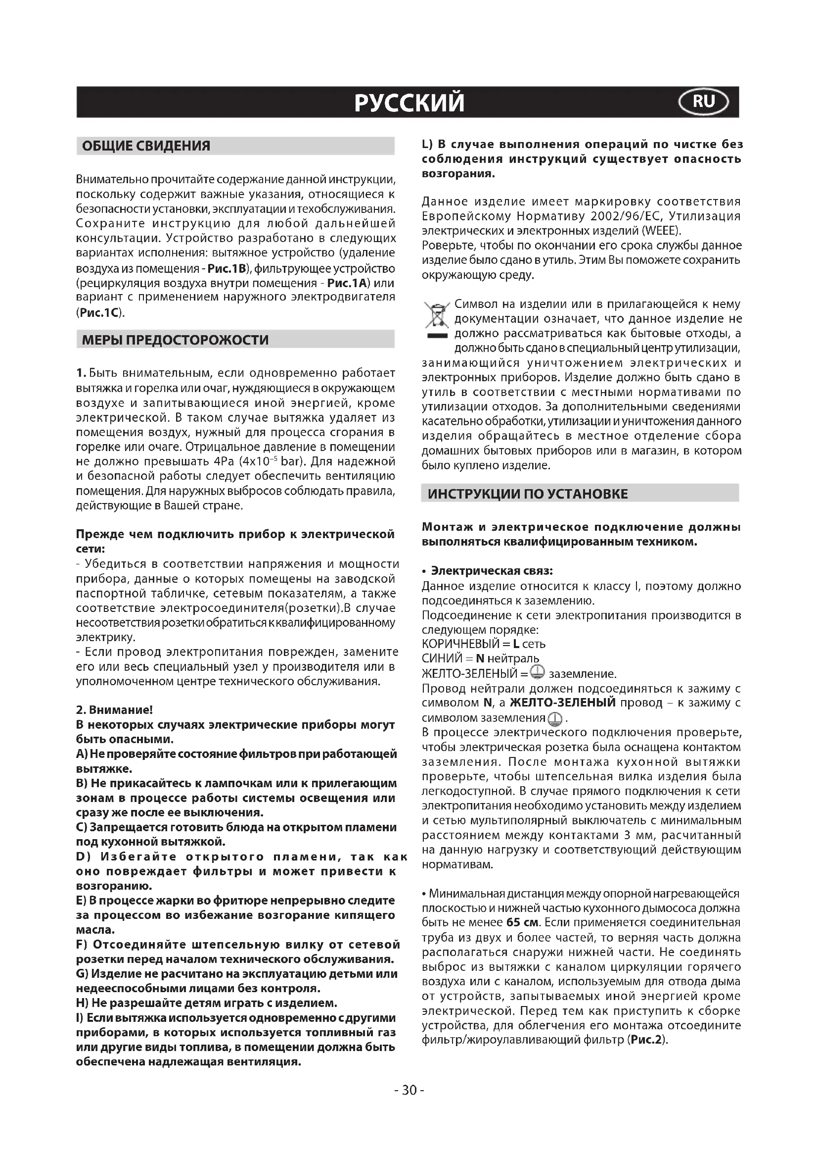 приборами, в которых используется топливный газ или другие виды топлива, в помещении должна быть обеспечена надлежащая вентиляция. L) В случае выполнения операций по чистке без соблюдения инструкций существует опасность возгорания. Данное изделие имеет маркировку соответствия Европейскому Нормативу 2002/96/ЕС, Утилизация электрических и электронных изделий (WEEE). Роверьте, чтобы по окончании его срока службы данное изделие было сдано в утиль. Этим Вы поможете сохранить окружающую среду. Символ на изделии или в прилагающейся к нему документации означает, что данное изделие не должно рассматриваться как бытовые отходы, а должно быть сдано в специальный центр утилизации, занимающийся уничтожением электрических и электронных приборов. Изделие должно быть сдано в утиль в соответствии с местными нормативами по утилизации отходов. За дополнительными сведениями касательно обработки, утилизации и уничтожения данного изделия обращайтесь в местное отделение сбора домашних бытовых приборов или в магазин, в котором было куплено изделие. ИНСТРУКЦИИ ПО УСТАНОВКЕ Монтаж и электрическое подключение должны выполняться квалифицированным техником.