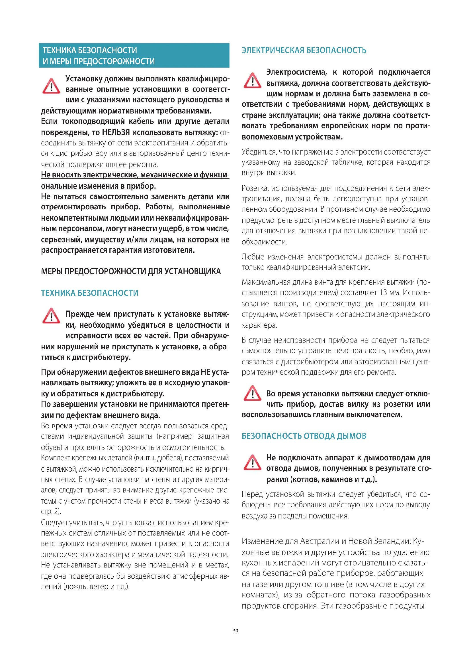 ным персоналом, могут нанести ущерб, в том числе, серьезный, имуществу и/или лицам, на которых не распространяется гарантия изготовителя. МЕРЫ ПРЕДОСТОРОЖНОСТИ ДЛЯ УСТАНОВЩИКА ТЕХНИКА БЕЗОПАСНОСТИ Прежде чем приступать к установке вытяж- ки, необходимо убедиться в целостности и исправности всех ее частей. При обнаруже- нии нарушений не приступать к установке, а обра- титься к дистрибьютеру. При обнаружении дефектов внешнего вида НЕ уста