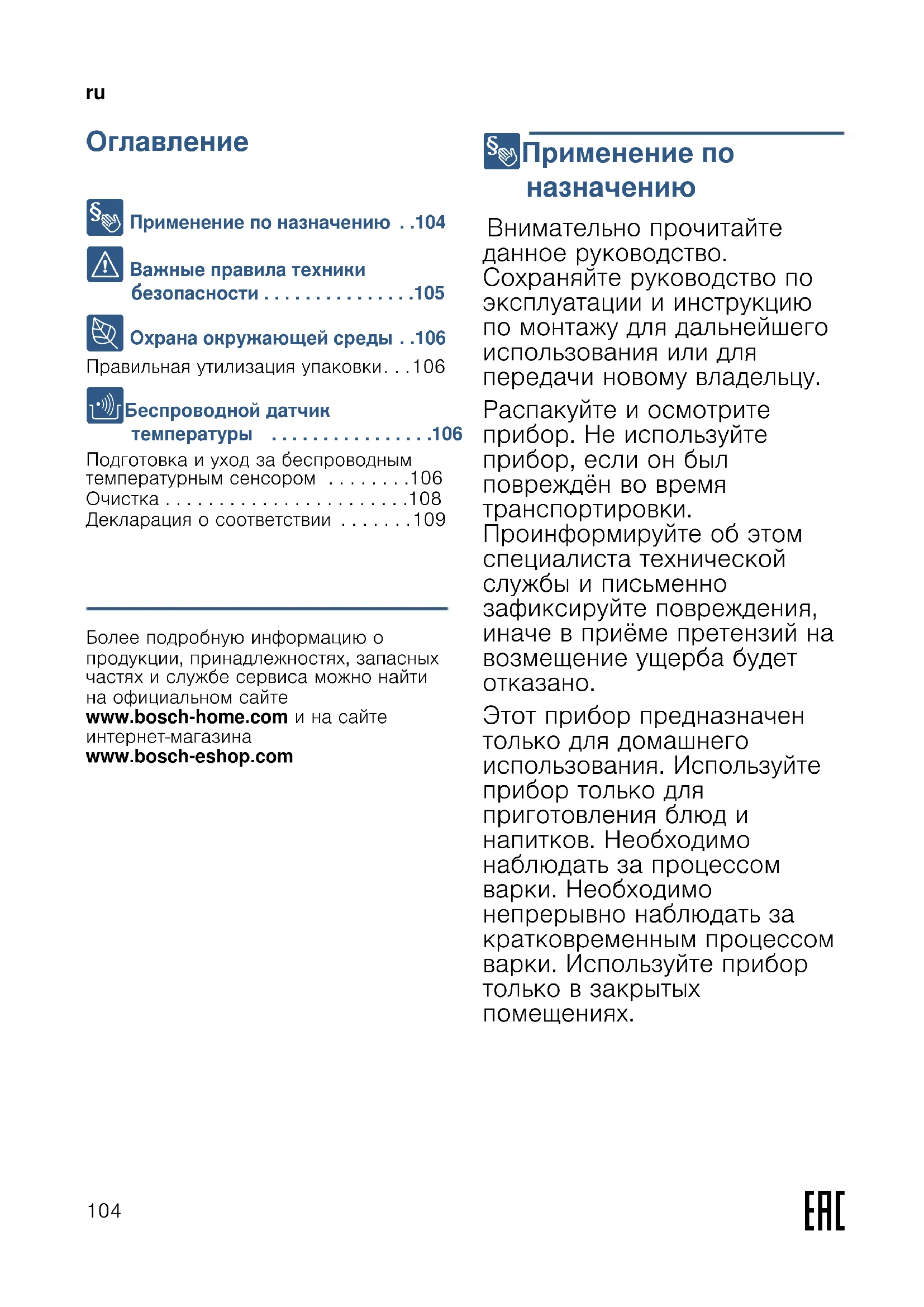 - Декларация о соответствии Produktinfo Более подробную информацию о продукции, принадлежностях, запасных частях и службе сервиса можно найти на официальном сайте www.bosch-home.com и на сайте интернет-магазина www.bosch-eshop.com 8 Применение по p. 109