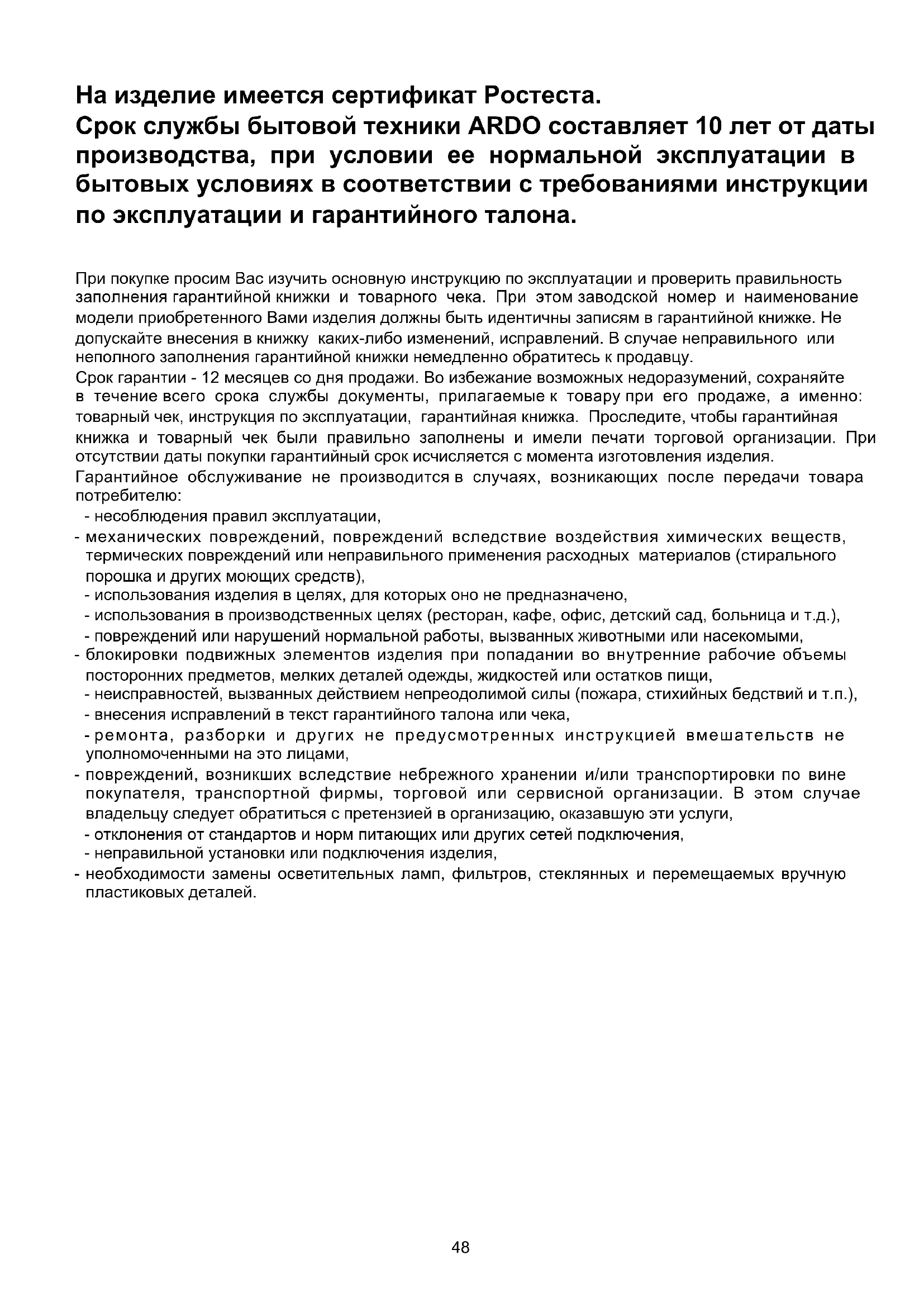 Pripojenie na svorkovnicu sa vykoná podľa vyobrazenia na obr.10 a 10/A: káblik L hnedý (fáza) káblik N modrý (nulovací) káblik zeleno-žltý (uzemnenie) Výrobca odmieta niesť akúkoľvek zodpovednosť v prípade možných nepresností, ku ktorým došlo chybami v tlači alebo prepise, v tejto manuálnej príručke. Výrobca si vyhradzuje právo na zavedenie akýchkoľvek úprav na vlastných produktoch, ak to považuje za vhodné, bez poškodenia dôležitých funkčných a bezpečnostných vlastností.48 На изделие имеется сертификат Ростеста. Срок службы бытовой техники ARDO составляет 10 лет от даты производства, при условии ее нормальной эксплуатации в бытовых условиях в соответствии с требованиями инструкции по эксплуатации и гарантийного талона. При покупке просим Вас изучить основную инструкцию по эксплуатации и проверить правильность заполнения гарантийной книжки и товарного чека. При этом заводской номер и наименование модели приобретенного Вами изделия должны быть идентичны записям в гарантийной книжке. Не допускайте внесения в книжку каких-либо изменений, исправлений. В случае неправильного или неполного заполнения гарантийной книжки немедленно обратитесь к продавцу. Срок гарантии - 12 месяцев со дня продажи. Во избежание возможных недоразумений, сохраняйте в течение всего срока службы документы, прилагаемые к товару при его продаже, а именно: товарный чек, инструкция по эксплуатации, гарантийная книжка. Проследите, чтобы гарантийная книжка и товарный чек были правильно заполнены и имели печати торговой организации. При отсутствии даты покупки гарантийный срок исчисляется с момента изготовления изделия. Гарантийное обслуживание не производится в случаях, возникающих после передачи товара потребителю: - несоблюдения правил эксплуатации, - механических повреждений, повреждений вследствие воздействия химических веществ, термических повреждений или неправильного применения расходных материалов (стирального порошка и других моющих средств), - использования изделия в целях, для которых оно не предназначено, - использования в производственных целях (ресторан, кафе, офис, детский сад, больница и т.д.), - повреждений или нарушений нормальной работы, вызванных животными или насекомыми, - блокировки подвижных элементов изделия при попадании во внутренние рабочие объемы посторонних предметов, мелких деталей одежды, жидкостей или остатков пищи, - неисправностей, вызванных действием непреодолимой силы (пожара, стихийных бедствий и т.п.), - внесения исправлений в текст гарантийного талона или чека, - ремонта, разборки и других не предусмотренных инструкцией вмешательств не уполномоченными на это лицами, - повреждений, возникших вследствие небрежного хранении и/или транспортировки по вине покупателя, транспортной фирмы, торговой или сервисной организации. В этом случае владельцу следует обратиться с претензией в организацию, оказавшую эти услуги, - отклонения от стандартов и норм питающих или других сетей подключения, - неправильной установки или подключения изделия, - необходимости замены осветительных ламп, фильтров, стеклянных и перемещаемых вручную пластиковых деталей.49 ОБЩИЕ РЕКОМЕНДАЦИИ ПО ИСПОЛЬЗОВАНИЮ Перед тем как устанавливать прибор и начать им пользоваться, просим Вас внимательно прочитать инструкцию по использованию. Очень важно, чтобы инструкция хранилась вместе с прибором, чтобы к ней можно было обращаться в будущем в случае возникновения каких-либо вопросов. В случае продажи или передачи прибора другому лицу пров