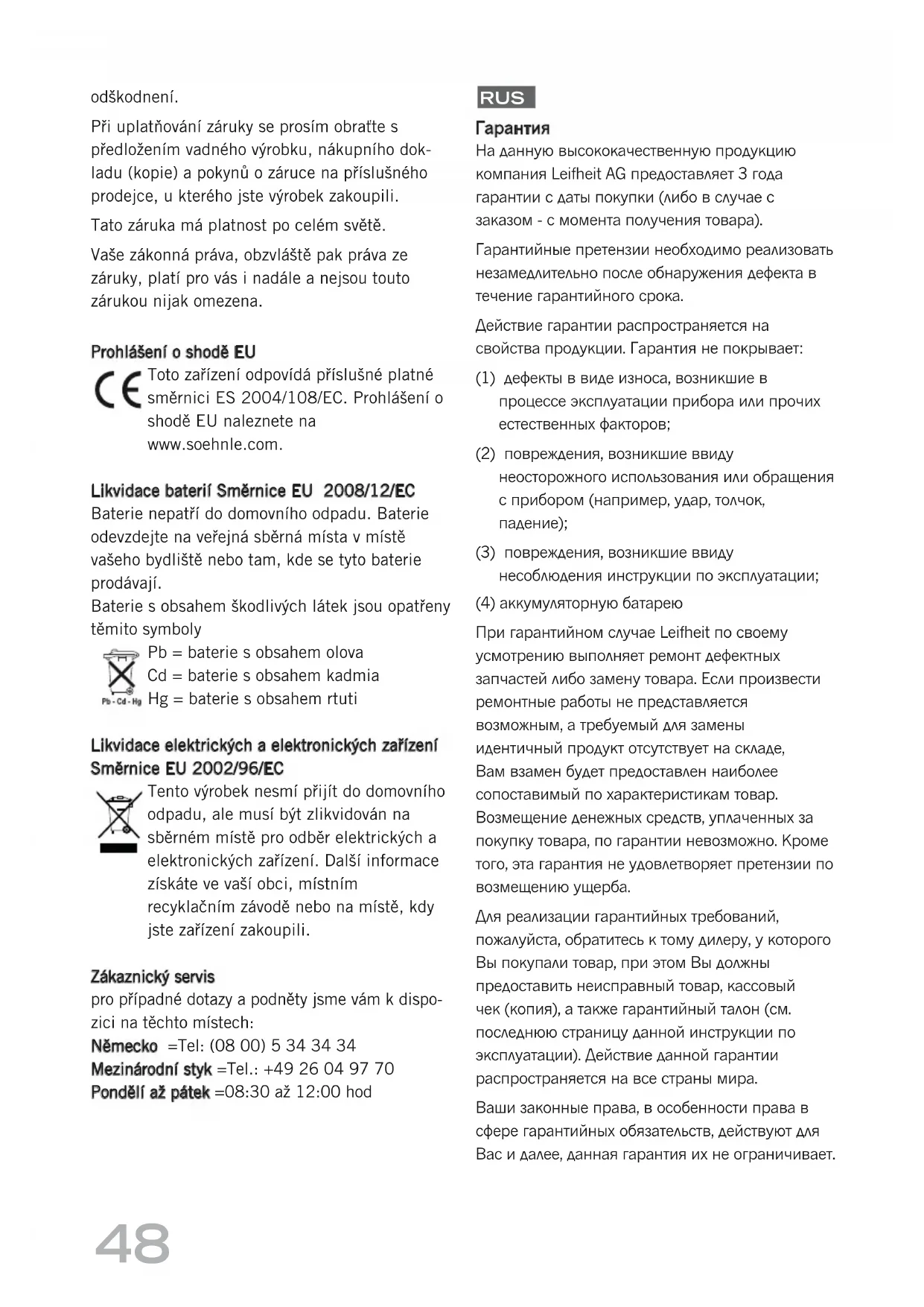 (3) повреждения, возникшие ввиду несоблюдения инструкции по эксплуатации; (4) аккумуляторную батарею При гарантийном случае Leifheit по своему усмотрению выполняет ремонт дефектных запчастей либо замену товара. Если произвести ремонтные работы не представляется возможным, а требуемый для замены идентичный продукт отсутствует на складе, Вам взамен будет предоставлен наиболее сопоставимый по характеристикам товар. Возмещение денежных средств, уплаченных за покупку товара, по гарантии невозможно. Кроме того, эта гарантия не удовлетворяет претензии по возмещению ущерба. Для реализации гарантийных требований, пожалуйста, обратитесь к тому дилеру, у которого Вы покупали товар, при этом Вы должны предоставить неисправный товар, кассовый чек (копия), а также гарантийный талон (см. последнюю страницу данной инструкции по эксплуатации). Действие данной гарантии распространяется на все страны мира. Ваши законные права, в особенности права в сфере гарантийных обязательств, действуют для Вас и далее, данная гарантия их не ограничивает.49 Соответствие стандартам ЕС Этот прибор соответствует действующей директиве 2004/108/EC. Декларация соответствия нормам ЕС приведена в интернете по адресу www.soehnle.com. Утилизация элементов питания Директива ЕС 2008/12/EC Элементы питания не относятся к бытовому мусору. Вам следует сдать Ваши отработанные элементы питания в официальный пункт приёма Вашего административного района или там, где продаются элементы питания соответствующего типа. Элементы питания, содержащие вредные вещества, имеют следующий знак Pb = Элемент питания содержит свинец Cd = Элемент питания содержит кадмий Hg = Элемент питания содержит ртуть Утилизация электрических и электронных приборов Директива ЕС 2002/96/EC Этот продукт не обрабатывается как стандартный домашний мусор, а подлежит сдаче в месте приёма для вторичной переработки электрических и электронных приборов. Дополнительную информацию Вы можете получить в администрации Вашего района, коммунальных предприятиях по утилизации или там, где Вы купили данный прибор. Сервис для потребителей Если у вас есть вопросы или предложения, то обращайтесь к нам по следующим телефонам: В Германии тел: (08 00) 5 34 34 34 В других странах тел.: +49 26 04 97 70 С понедельника по пятницу с 08:30 до 12:00