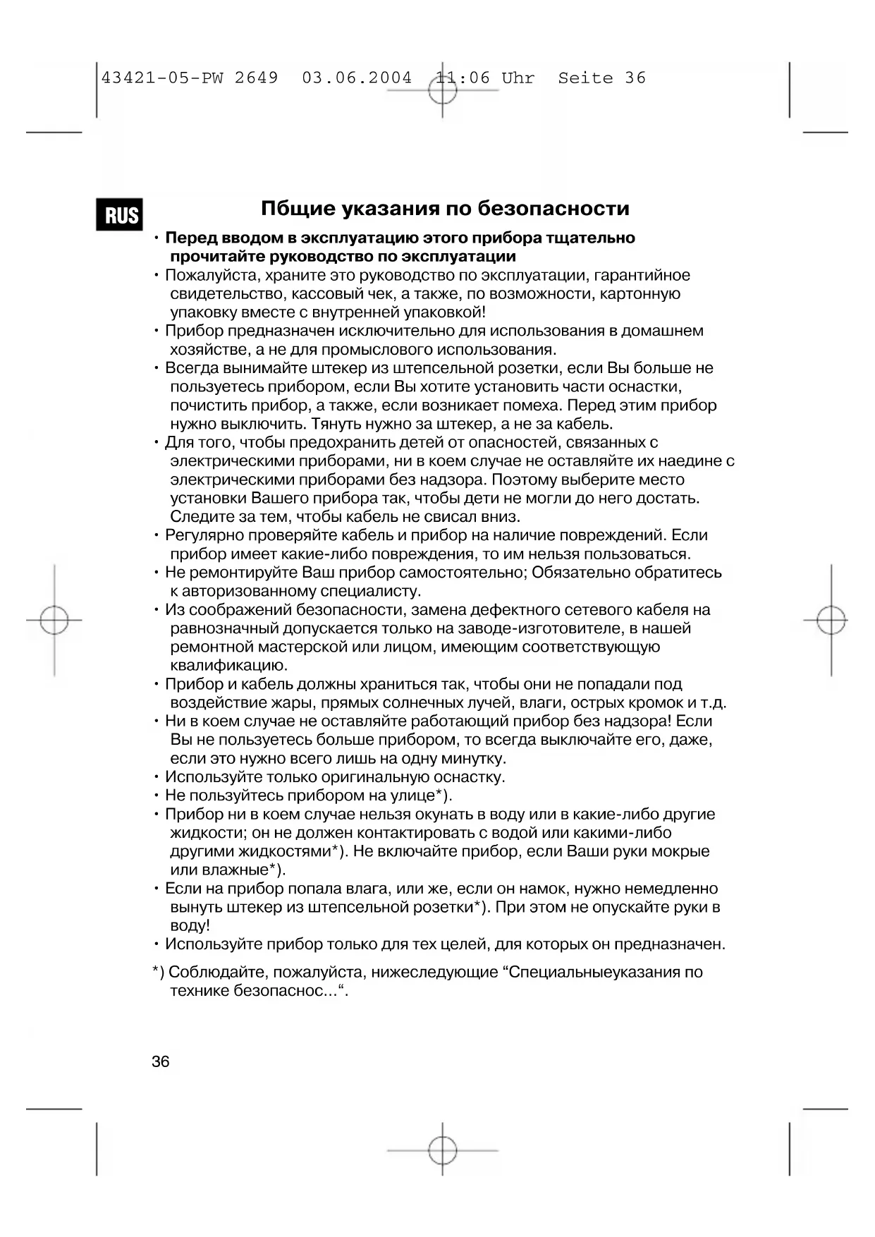 - Используйте прибор только для тех целей, для которых он предназначен. *) Соблюдайте, пожалуйста, нижеследующие “Специальныеуказания по технике безопаснос...“.