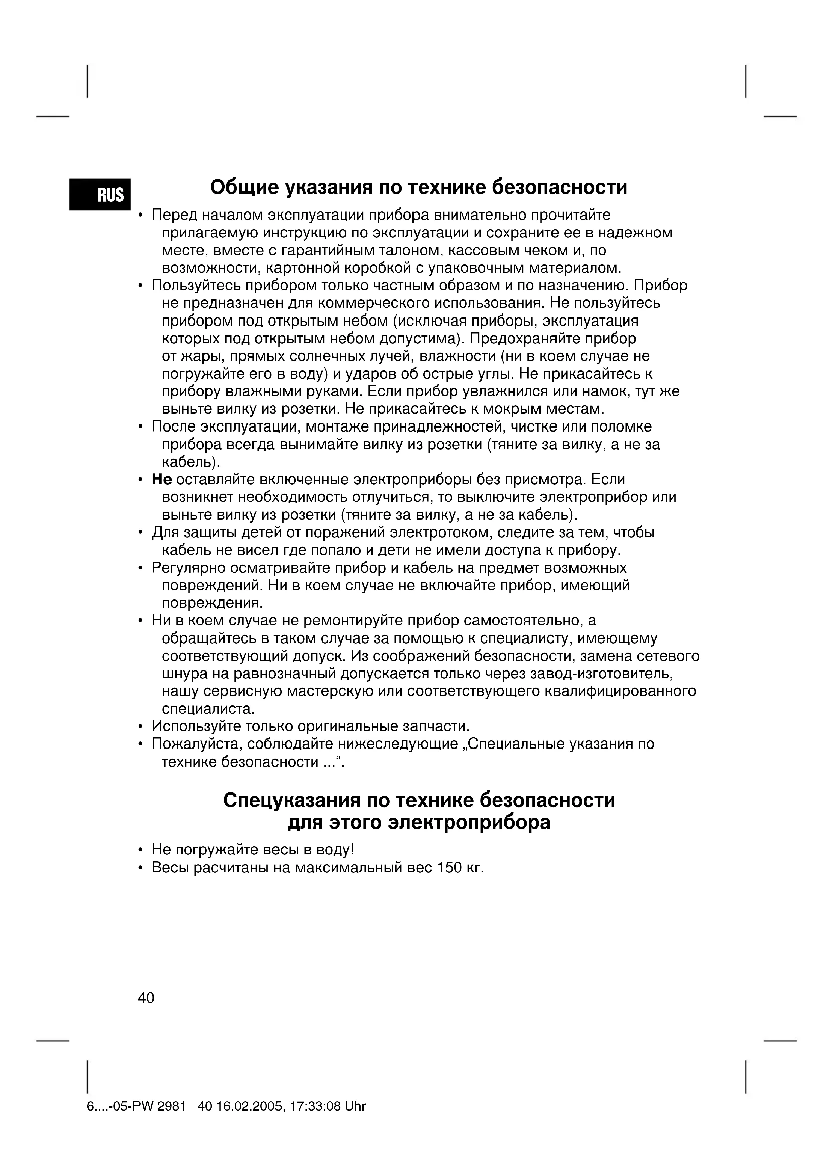 - Весы расчитаны на максимальный вес 150 кг. 6....-05-PW 2981 40 16.02.2005, 17:33:08 UhrRUS