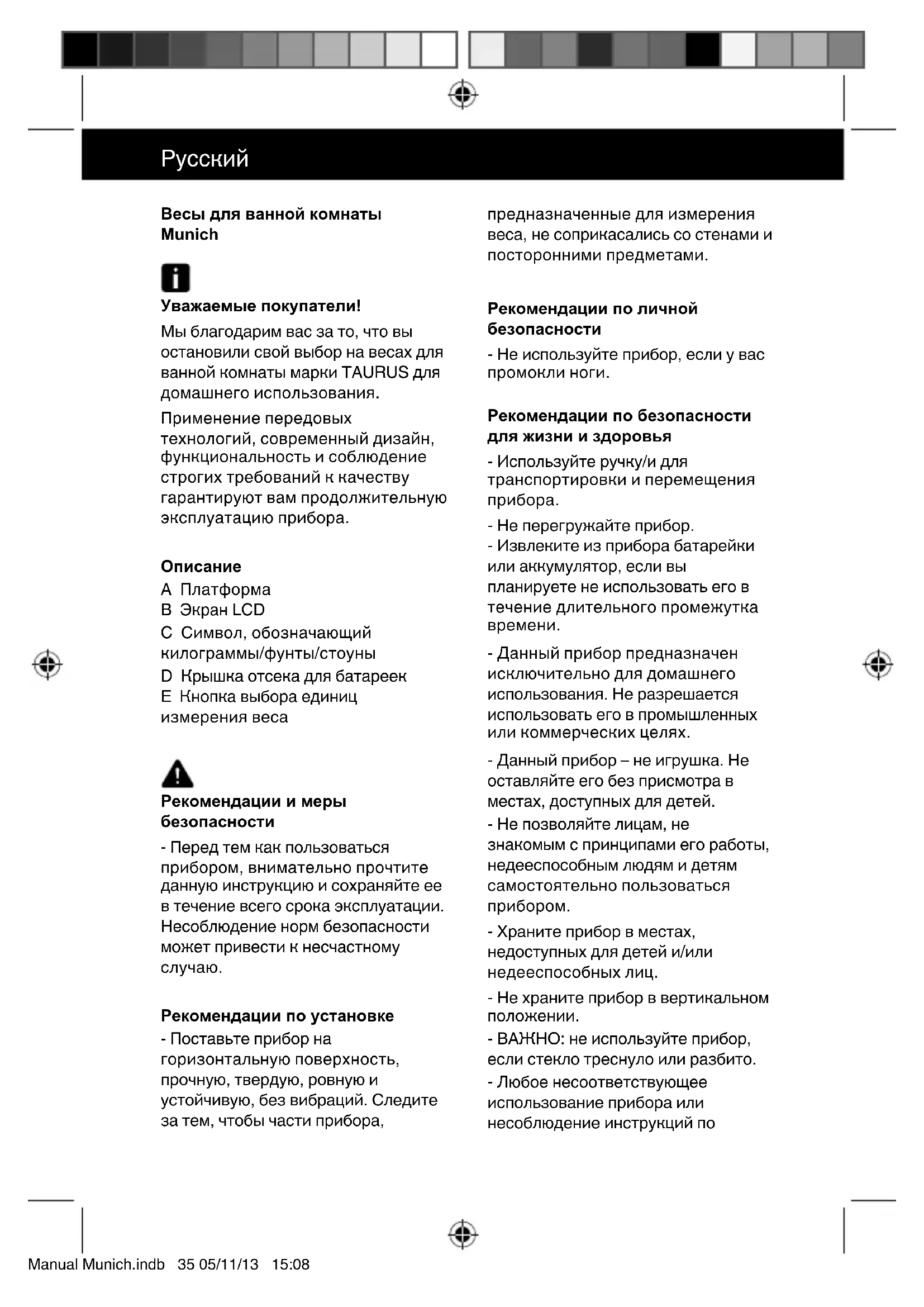 A Платформа B Экран LCD C Символ, обозначающий килограммы/фунты/стоуны D Крышка отсека для батареек E Кнопка выбора единиц измерения веса Рекомендации и меры безопасности - Перед тем как пользоваться прибором, внимательно прочтите данную инструкцию и сохраняйте ее в течение всего срока эксплуатации. Несоблюдение норм безопасности может привести к несчастному