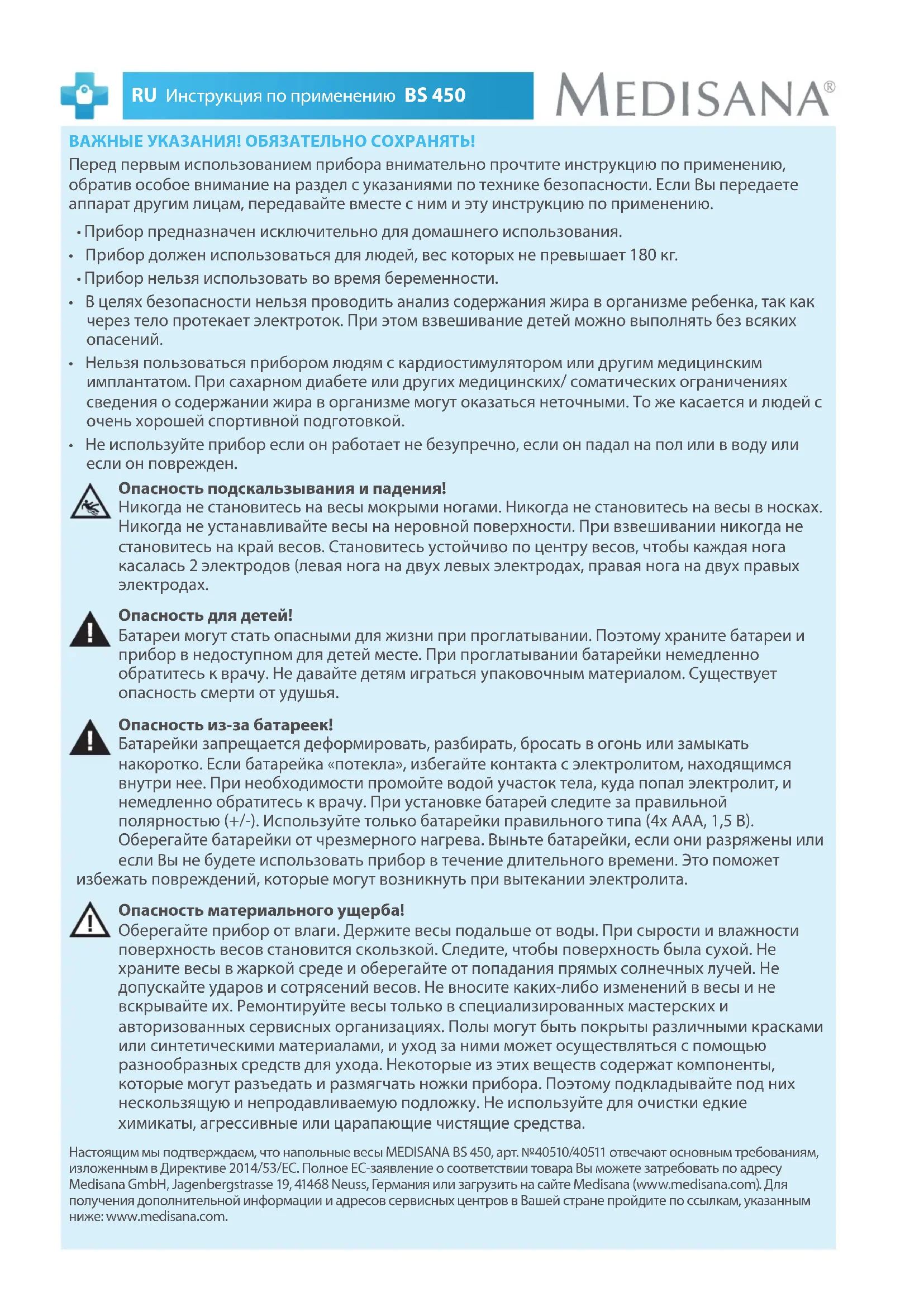 - Не используйте прибор если он работает не безупречно, если он падал на пол или в воду или если он поврежден. Опасность подскальзывания и падения! Никогда не становитесь на весы мокрыми ногами. Никогда не становитесь на весы в носках. Никогда не устанавливайте весы на неровной поверхности. При взвешивании никогда не становитесь на край весов. Становитесь устойчиво по центру весов, чтобы каждая нога касалась 2 электродов (левая нога на двух левых электродах, правая нога на двух правых электродах. Опасность для детей! Батареи могут стать опасными для жизни при проглатывании. Поэтому храните батареи и прибор в недоступном для детей месте. При проглатывании батарейки немедленно обратитесь к врачу. Не давайте детям играться упаковочным материалом. Существует опасность смерти от удушья. Опасность из-за батареек! Батарейки запрещается деформировать, разбирать, бросать в огонь или замыкать накоротко. Если батарейка «потекла», избегайте контакта с электролитом, находящимся внутри нее. При необходимости промойте водой участок тела, куда попал электролит, и немедленно обратитесь к врачу. При установке батарей следите за правильной полярностью (+/-). Используйте только батарейки правильного типа (4x AAA, 1,5 В). Оберегайте батарейки от чрезмерного нагрева. Выньте батарейки, если они разряжены или если Вы не будете использовать прибор в течение длительного времени. Это поможет избежать повреждений, которые могут возникнуть при вытекании электролита. Опасность материального ущерба! Оберегайте прибор от влаги. Держите весы подальше от воды. При сырости и влажности поверхность весов становится скользкой. Следите, чтобы поверхность была сухой. Не храните весы в жаркой среде и оберегайте от попадания прямых солнечных лучей. Не допускайте ударов и сотрясений весов. Не вносите каких-либо изменений в весы и не вскрывайте их. Ремонтируйте весы только в специализированных мастерских и авторизованных сервисных организациях. Полы могут быть покрыты различными красками или синтетическими материалами, и уход за ними может осуществляться с помощью разнообразных средств для ухода. Некоторые из этих веществ содержат компоненты, которые могут разъедать и размягчать ножки прибора. Поэтому подкладывайте под них нескользящую и непродавливаемую подложку. Не используйте для очистки едкие химикаты, агрессивные или царапающие чистящие средства. Настоящим мы подтверждаем, что напольные весы MEDISANA BS 450, арт. №40510/40511 отвечают основным требованиям, изложенным в Директиве 2014/53/ЕС. Полное ЕС-заявление о соответствии товара Вы можете затребовать по адресу Medisana GmbH, Jagenbergstrasse 19, 41468 Neuss, Германия или загрузить на сайте Medisana (www.medisana.com). Для получения дополнительной информации и адресов сервисных центров в Вашей стране пройдите по ссылкам, указанным ниже: www.medisana.com.59 BS 450 Инструкция по применению RU B) Установка персональных данных на весах / Измерение массы тела с проведением диагностики
