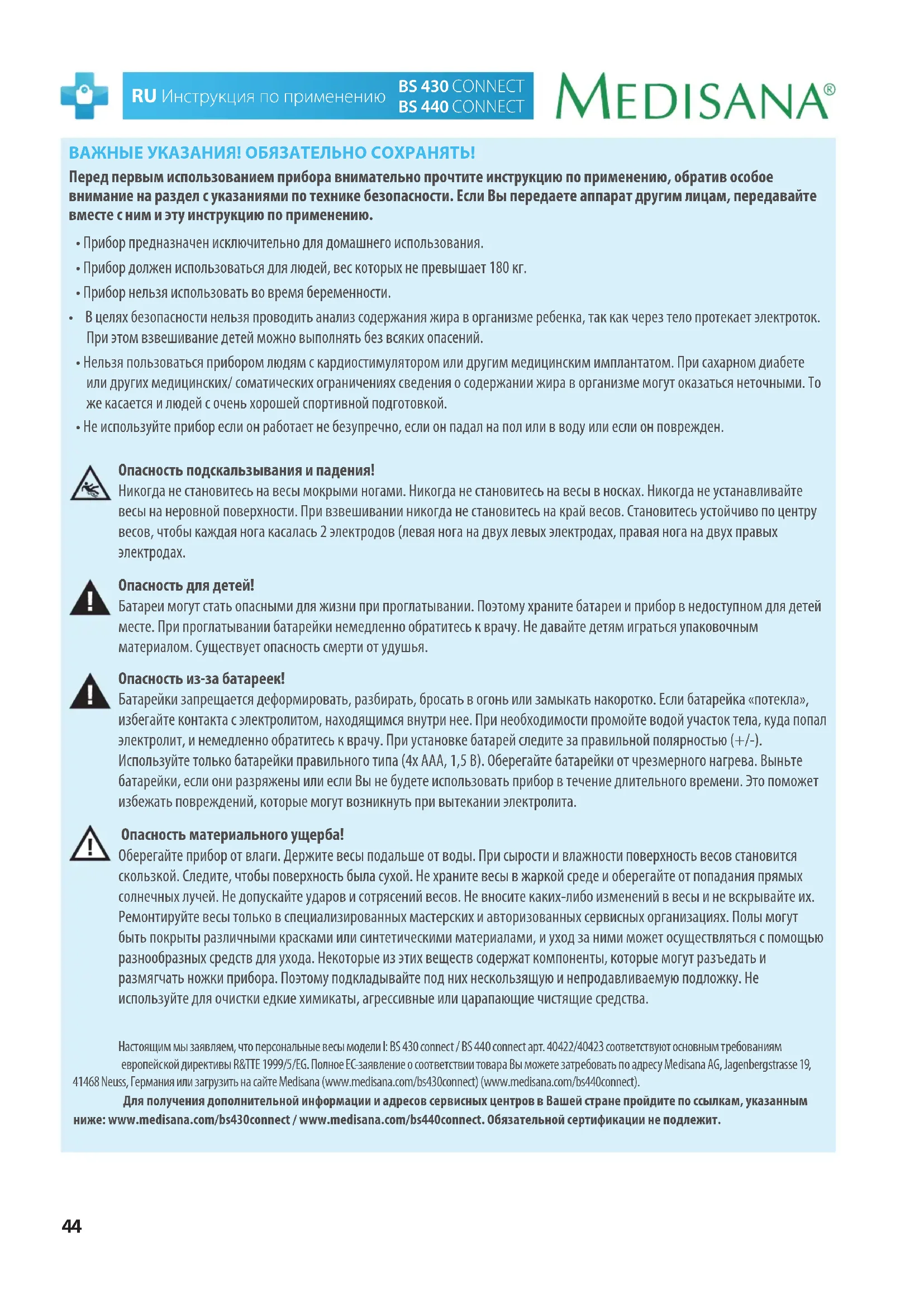 - Не используйте прибор если он работает не безупречно, если он падал на пол или в воду или если он поврежден. Опасность подскальзывания и падения! Никогда не становитесь на весы мокрыми ногами. Никогда не становитесь на весы в носках. Никогда не устанавливайте весы на неровной поверхности. При взвешивании никогда не становитесь на край весов. Становитесь устойчиво по центру весов, чтобы каждая нога касалась 2 электродов (левая нога на двух левых электродах, правая нога на двух правых электродах. Опасность для детей! Батареи могут стать опасными для жизни при проглатывании. Поэтому храните батареи и прибор в недоступном для детей месте. При проглатывании батарейки немедленно обратитесь к врачу. Не давайте детям играться упаковочным материалом. Существует опасность смерти от удушья. Опасность из-за батареек! Батарейки запрещается деформировать, разбирать, бросать в огонь или замыкать накоротко. Если батарейка «потекла», избегайте контакта с электролитом, находящимся внутри нее. При необходимости промойте водой участок тела, куда попал электролит, и немедленно обратитесь к врачу. При установке батарей следите за правильной полярностью (+/-). Используйте только батарейки правильного типа (4x AAA, 1,5 В). Оберегайте батарейки от чрезмерного нагрева. Выньте батарейки, если они разряжены или если Вы не будете использовать прибор в течение длительного времени. Это поможет избежать повреждений, которые могут возникнуть при вытекании электролита. Опасность материального ущерба! Оберегайте прибор от влаги. Держите весы подальше от воды. При сырости и влажности поверхность весов становится скользкой. Следите, чтобы поверхность была сухой. Не храните весы в жаркой среде и оберегайте от попадания прямых солнечных лучей. Не допускайте ударов и сотрясений весов. Не вносите каких-либо изменений в весы и не вскрывайте их. Ремонтируйте весы только в специализированных мастерских и авторизованных сервисных организациях. Полы могут быть покрыты различными красками или синтетическими материалами, и уход за ними может осуществляться с помощью разнообразных средств для ухода. Некоторые из этих веществ содержат компоненты, которые могут разъедать и размягчать ножки прибора. Поэтому подкладывайте под них нескользящую и непродавливаемую подложку. Не используйте для очистки едкие химикаты, агрессивные или царапающие чистящие средства. Настоящим мы заявляем, что персональные весы модели l: BS 430 connect / BS 440 connect арт. 40422/40423 соответствуют основным требованиям европейской директивы R&TTE 1999/5/EG. Полное ЕС-заявление о соответствии товара Вы можете затребовать по адресу Medisana AG, Jagenbergstrasse 19, 41468 Neuss, Германия или загрузить на сайте Medisana (www.medisana.com/bs430connect) (www.medisana.com/bs440connect). Для получения дополнительной информации и адресов сервисных центров в Вашей стране пройдите по ссылкам, указанным ниже: www.medisana.com/bs430connect / www.medisana.com/bs440connect. Обязательной сертификации не подлежит.45 BS 430 CONNECT BS 440 CONNECT Инструкция по применению RU Bluetooth Devices GeneralBluetooth