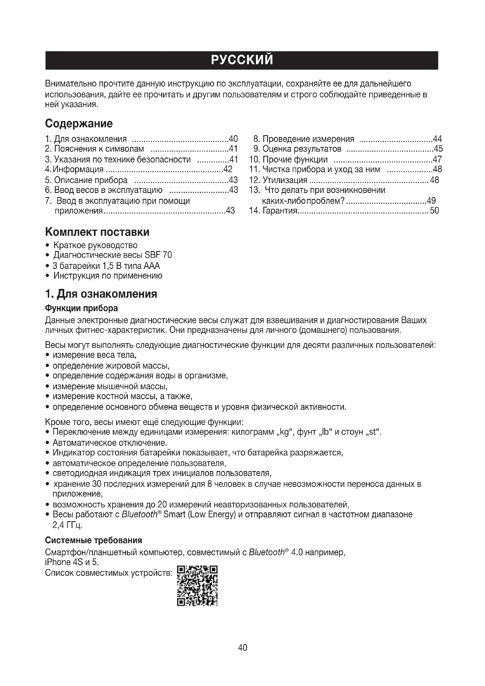 Функции прибора Данные электронные диагностические весы служат для взвешивания и диагностирования Ваших личных фитнес-характеристик. Они предназначены для личного (домашнего) пользования. Весы могут выполнять следующие диагностические функции для десяти различных пользователей: