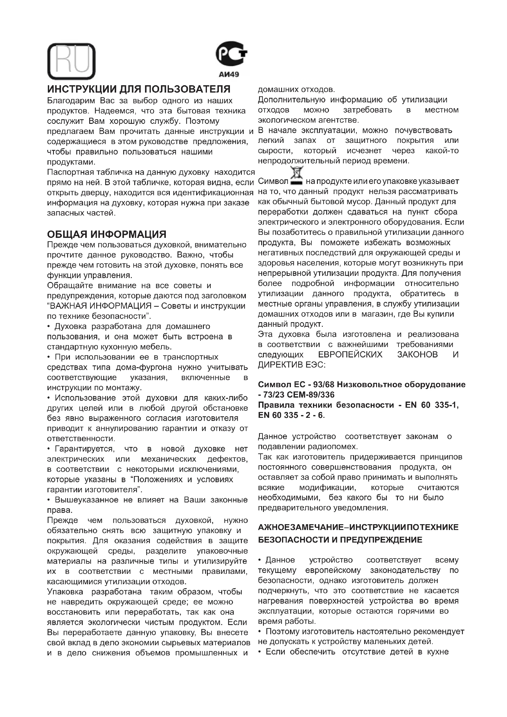 Прежде чем пользоваться духовкой, нужно обязательно снять всю защитную упаковку и покрытия. Для оказания содействия в защите окружающей среды, разделите упаковочные материалы на различные типы и утилизируйте их в соответствии с местными правилами, касающимися утилизации отходов. Упаковка разработана таким образом, чтобы не навредить окружающей среде; ее можно восстановить или переработать, так как она является экологически чистым продуктом. Если Вы переработаете данную упаковку, Вы внесете свой вклад в дело экономии сырьевых материалов и в дело снижения объемов промышленных и домашних отходов. Дополнительную информацию об утилизации отходов можно затребовать в местном экологическом агентстве. В начале эксплуатации, можно почувствовать легкий запах от защитного покрытия или сырости, который исчезнет через какой-то непродолжительный период времени. Символ на продукте или его упаковке указывает на то, что данный продукт нельзя рассматривать как обычный бытовой мусор. Данный продукт для переработки должен сдаваться на пункт сбора электрического и электронного оборудования. Если Вы позаботитесь о правильной утилизации данного продукта, Вы поможете избежать возможных негативных последствий для окружающей среды и здоровья населения, которые могут возникнуть при непрерывной утилизации продукта. Для получения более подробной информации относительно утилизации данного продукта, обратитесь в местные органы управления, в службу утилизации домашних отходов или в магазин, где Вы купили данный продукт. Эта духовка была изготовлена и реализована в соответствии с важнейшими требованиями следующих ЕВРОПЕЙСКИХ ЗАКОНОВ И ДИРЕКТИВ ЕЭС: Символ EС - 93/68 Низковольтное оборудование - 73/23 СEM-89/336 Правила техники безопасности - EN 60 335-1, EN 60 335 - 2 - 6. Данное устройство соответствует законам о подавлении радиопомех. Так как изготовитель придерживается принципов постоянного совершенствования продукта, он оставляет за собой право принимать и выполнять всякие модификации, которые считаются необходимыми, без какого бы то ни было предварительного уведомления. АЖНОЕ ЗАМЕЧАНИЕ – ИНСТРУКЦИИ ПО ТЕХНИКЕ БЕЗОПАСНОСТИ И ПРЕДУПРЕЖДЕНИЕ