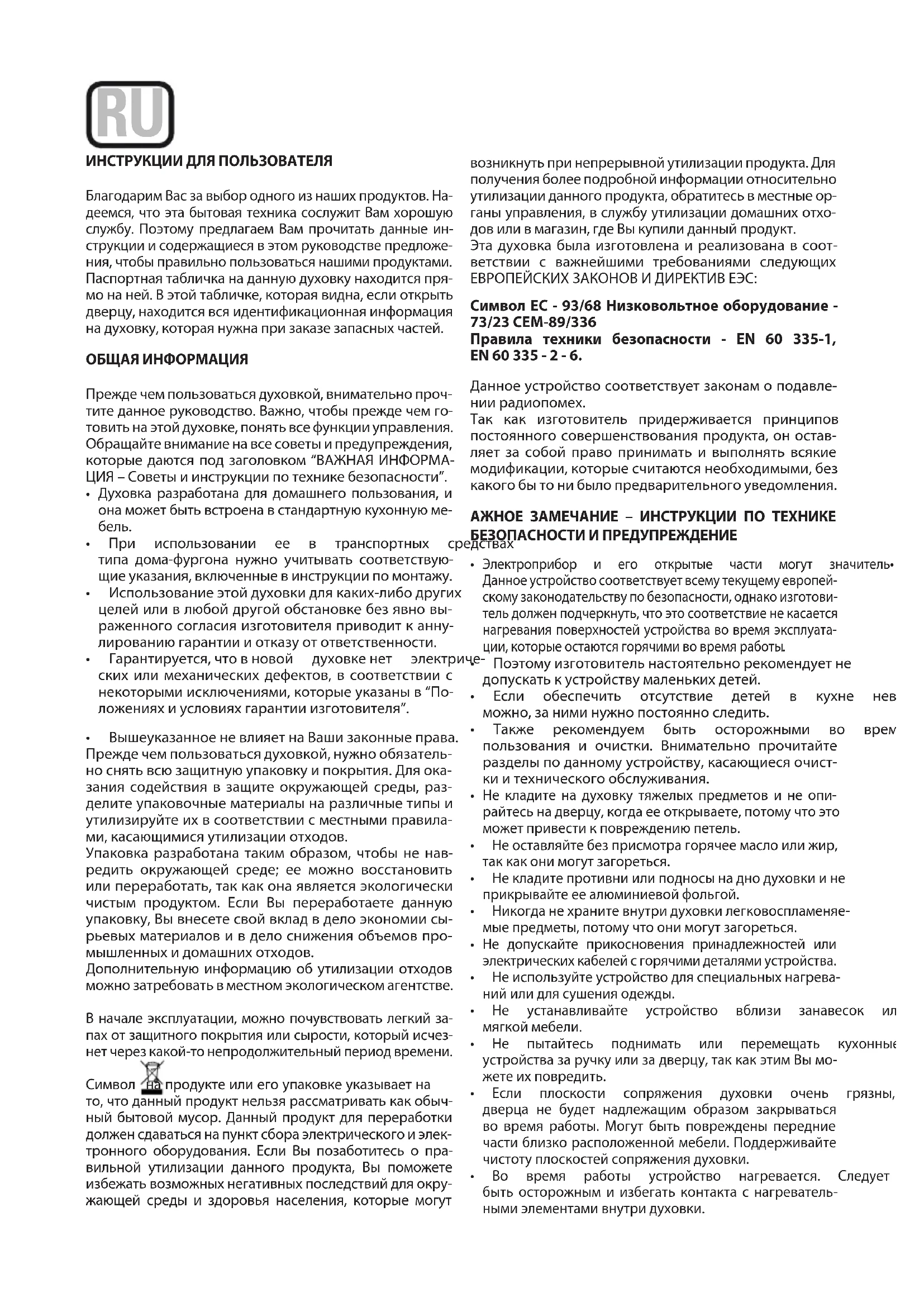 - ВышеуказанноеневлияетнаВашизаконныеправа. Прежде чем пользоваться духовкой, нужно обязатель- но снять всю защитную упаковку и покрытия. Для ока- зания содействия в защите окружающей среды, раз- делите упаковочные материалы на различные типы и утилизируйте их в соответствии с местными правила- ми, касающимися утилизации отходов. Упаковка разработана таким образом, чтобы не нав- редить окружающей среде; ее можно восстановить или переработать, так как она является экологически чистым продуктом. Если Вы переработаете данную упаковку, Вы внесете свой вклад в дело экономии сы- рьевых материалов и в дело снижения объемов про- мышленных и домашних отходов. Дополнительную информацию об утилизации отходов можно затребовать в местном экологическом агентстве. В начале эксплуатации, можно почувствовать легкий за- пах от защитного покрытия или сырости, который исчез- нет через какой-то непродолжительный период времени. Символ на продукте или его упаковке указывает на то, что данный продукт нельзя рассматривать как обыч- ный бытовой мусор. Данный продукт для переработки должен сдаваться на пункт сбора электрического и элек- тронного оборудования. Если Вы позаботитесь о пра- вильной утилизации данного продукта, Вы поможете избежать возможных негативных последствий для окру- жающей среды и здоровья населения, которые могут возникнуть при непрерывной утилизации продукта. Для получения более подробной информации относительно утилизации данного продукта, обратитесь в местные ор- ганы управления, в службу утилизации домашних отхо- дов или в магазин, где Вы купили данный продукт. Эта духовка была изготовлена и реализована в соот- ветствии с важнейшими требованиями следующих ЕВРОПЕЙСКИХ ЗАКОНОВ И ДИРЕКТИВ ЕЭС: Символ EС - 93/68 Низковольтное оборудование - 73/23 СEM-89/336 Правила техники безопасности - EN 60 335-1, EN 60 335 - 2 - 6. Данное устройство соответствует законам о подавле- нии радиопомех. Так как изготовитель придерживается принципов постоянного совершенствования продукта, он остав- ляет за собой право принимать и выполнять всякие модификации, которые считаются необходимыми, без какого бы то ни было предварительного уведомления. АЖНОЕ ЗАМЕЧАНИЕ – ИНСТРУКЦИИ ПО ТЕХНИКЕ БЕЗОПАСНОСТИ И ПРЕДУПРЕЖДЕНИЕ