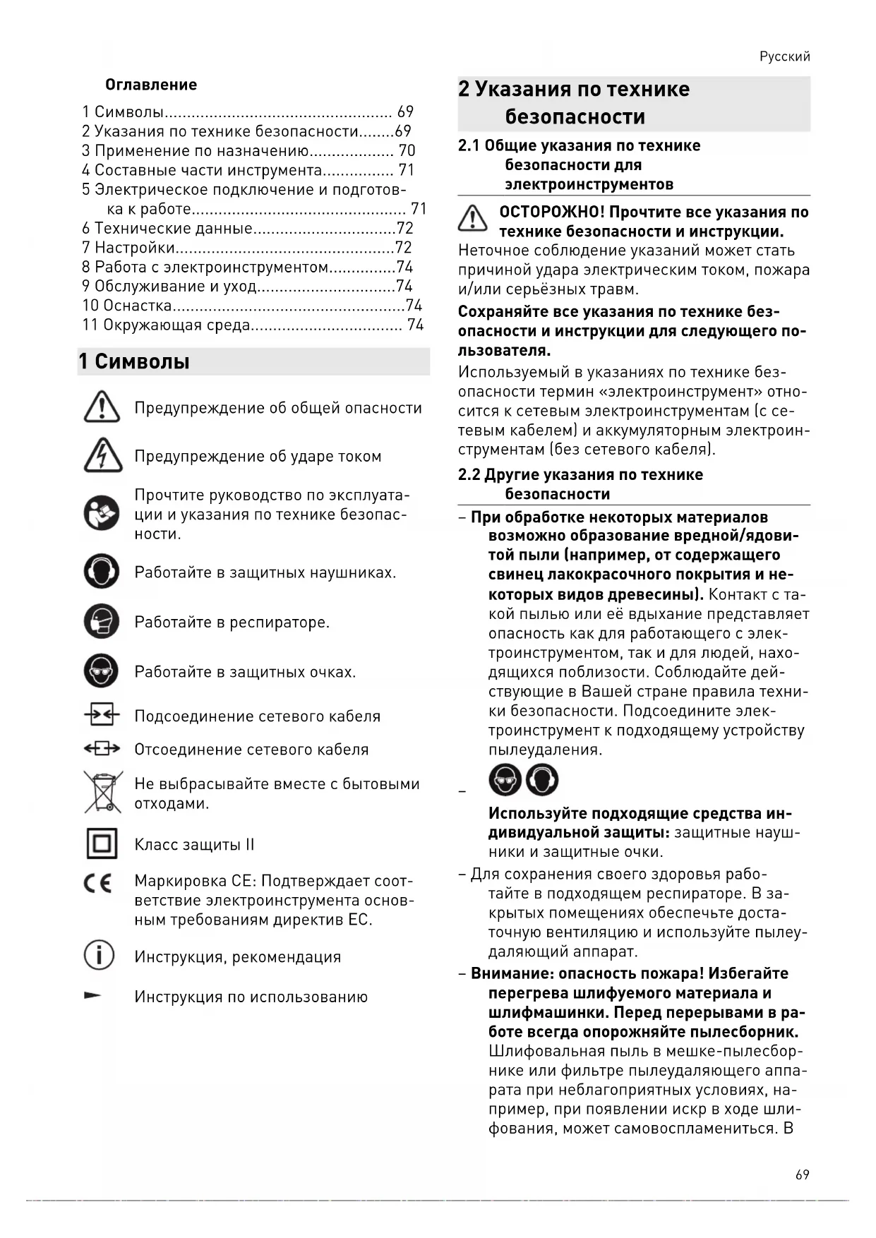 Класс защиты II Маркировка CE: Подтверждает соот ветствие электроинструмента основ ным требованиям директив ЕС. Инструкция, рекомендация Инструкция по использованию 2 Указания по технике безопасности