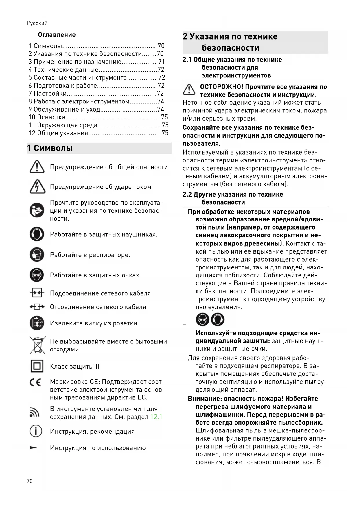 Класс защиты II Маркировка CE: Подтверждает соот ветствие электроинструмента основ ным требованиям директив ЕС. В инструменте установлен чип для сохранения данных. См. раздел 12.1 Инструкция, рекомендация Инструкция по использованию 2 Указания по технике безопасности