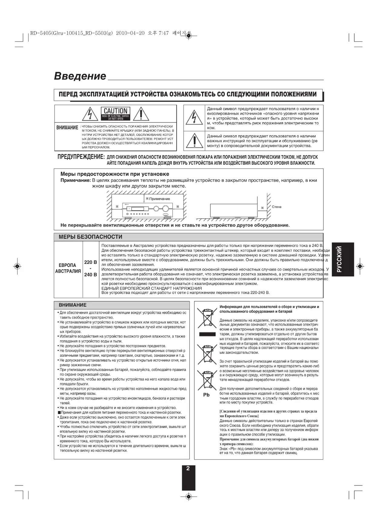 - Для обеспечения достаточной вентиляции вокруг устройства необходимо оставить свободное пространство.• Не устанавливайте устройство в слишком жарких или холодных местах, которые подвержены воздействию прямых солнечных лучей или нагревательных приборов. • Избегайте воздействия на устройство высокого уровня влажности, а такжепопадания в устройство воды и пыли.• Не допускайте попадания в устройство посторонних предметов.• Не блокируйте вентиляцию путем перекрытия вентиляционных отверстий различными предметами, например газетами, скатертью, занавесками и т.д.• Не допускается устанавливать на устройство открытые источники огня, например зажженные свечи.• При утилизации использованных батарей, пожалуйста, соблюдайте правилапо охране окружающей среды.• Не допускайте, чтобы во время работы устройства на него капала вода илипопадали брызги.• Не допускается устанавливать на устройство наполненные жидкостью предметы, например вазы.• Не допускайте попадания на устройство инсектицидов, бензола и растворителей.• Ни в коем случае не разбирайте и не вносите изменения в устройство.■Примечания для кабеля питания переменного тока и настенной розетки.• Даже если устройство выключено, оно остается подключенным к сети электропитания, пока оно подключено к настенной розетке. • Чтобы полностью отключить устройство от сети электропитания, выньте штепсельную вилку из настенной розетки.• При настройке устройства убедитесь в наличии легкого доступа к розетке переменного тока, которую Вы используете.• Если устройство не используется в течение длительного времени, выньте штепсельную вилку из настенной розетки.Информация для пользователей о сборе и утилизации использованного оборудования и батарейДанные символы на изделиях, упаковке и/или сопроводительных документах означают, что использованные электрические и электронные приборы, а также аккумуляторные батареи, должны утилизироваться отдельно от других бытовых отходов. В целях надлежащей переработки использованных изделий и батарей, пожалуйста, относите их в соответствующие пункты сбора в соответствии с Вашим национальным законодательством.За счет правильной утилизации изделий и батарей вы поможете сохранить ценные ресурсы и предотвратить какие-либо возможные негативные воздействия на здоровье человека и окружающую среду, которые могут возникнуть в результате ненадлежащей переработки отходов.Для получения дополнительных сведений о сборе и переработке использованных изделий и батарей, обратитесь к местным городским властям, в службу по переработке отходовили по месту покупки устройств.[Сведения об утилизации изделия в других странах за пределами Европейского Союза]Данные символы действительны только в странах Европейского Союза. Если необходима утилизация изделия, обратитесь к местным властям или дилеру за получением информации о правильном способе утилизации.Примечание для символа аккумуляторных батарей (два нижних примера символов):Знак «Pb» под символом аккумуляторных батарей указывает на то, что данная батарея содержит свинец. RD-5405(G)ru-100415_RD-5503(g) 2010-04-20 오후 7:47 페이지 23