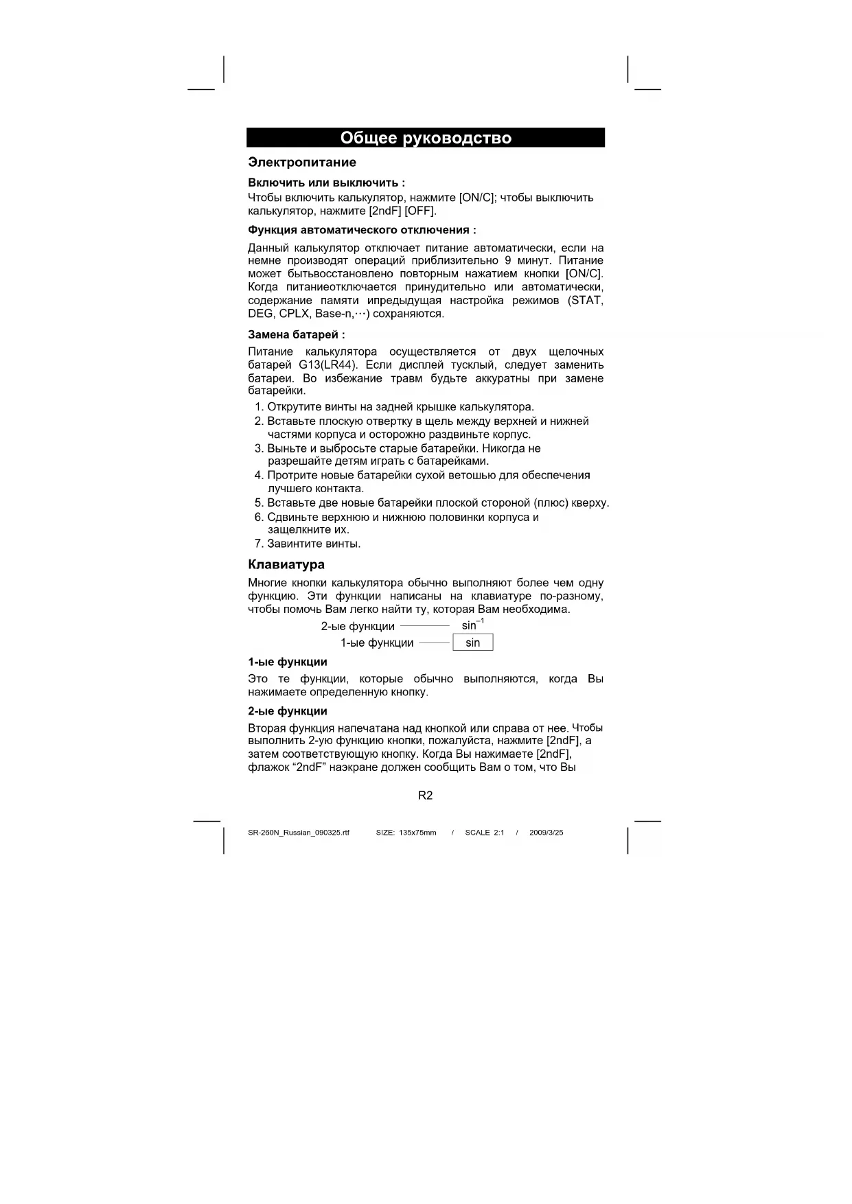 выполнить 2-ую функцию кнопки, пожалуйста, нажмите [2ndF], а затем соответствующую кнопку. Когда Вы нажимаете [2ndF], флажок “2ndF” наэкране должен сообщить Вам о том, что ВыSR-260N_Russian_090325.rtf SIZE: 135x75mm / SCALE 2:1 / 2009/3/25