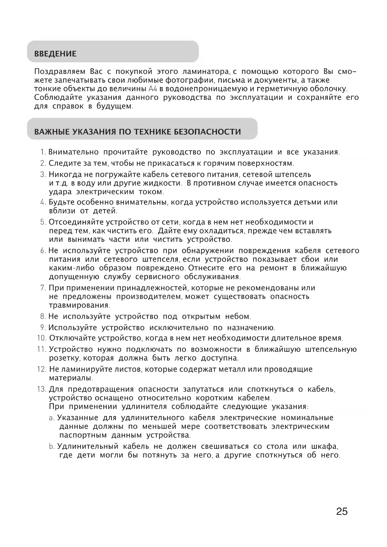Поздравляем Вас с покупкой этого ламинатора, с помощью которого Вы смо- жете запечатывать свои любимые фотографии, письма и документы, а также тонкие объекты до величины A4 в водонепроницаемую и герметичную оболочку. Соблюдайте указания данного руководства по эксплуатации и сохраняйте его для справок в будущем. ВАЖНЫЕ УКАЗАНИЯ ПО ТЕХНИКЕ БЕЗОПАСНОСТИ