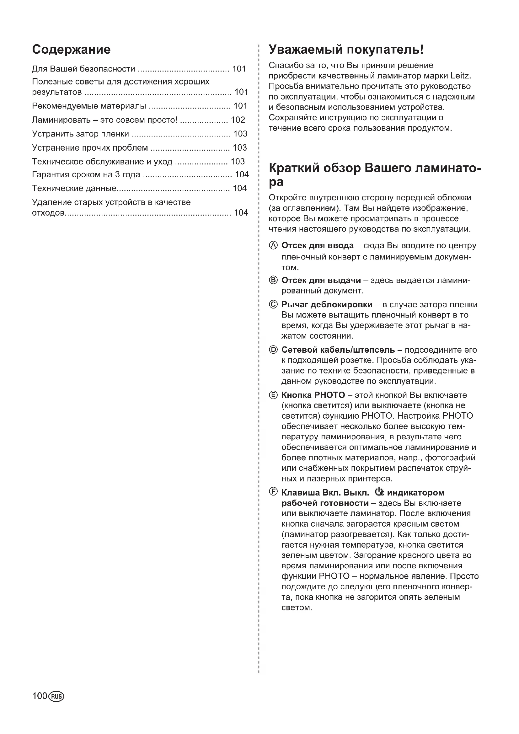 - Удаление старых устройств в качестве отходов Уважаемый покупатель! Спасибо за то, что Вы приняли решение приобрести качественный ламинатор марки Leitz. Просьба внимательно прочитать это руководство по эксплуатации, чтобы ознакомиться с надежным и безопасным использованием устройства. Сохраняйте инструкцию по эксплуатации в течение всего срока пользования продуктом. p. 104