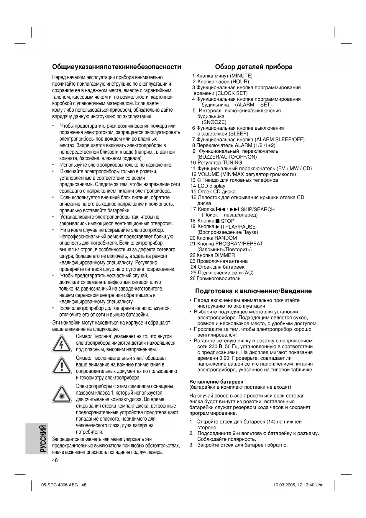 05-SRC 4306 AEG 48 10.03.2005, 12:13:40 Uhr Перед началом эксплуатации прибора внимательно прочитайте прилагаемую инструкцию по эксплуатации и сохраните ее в надежном месте, вместе с гарантийным талоном, кассовым чеком и, по возможности, картонной коробкой с упаковочным материалом. Если даете кому-либо попользоваться прибором, обязательно дайте впридачу данную инструкцию по эксплуатации.