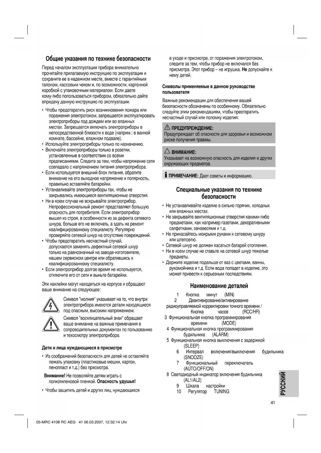 - Держите изделие подальше от ваз с цветами, ванны, рукомойника и т.д. Если вода попадет в изделие, это может привести к серьезным последствиям. Наименование деталей 1 Кнопка минут (MIN) 2 Деактивирование/активирование радиоуправляемой корректировки точного времени / Кнопка часов (RCC/HR) 3 Функциональная кнопка программирования времени (MODE) 4 Функциональная кнопка программирования будильника (ALARM) 5 Функциональная кнопка выключения с задержкой (SLEEP) 6 Интервал включения/выключения будильника (SNOOZE) 7 Функциональный переключатель (AUTO/OFF/ON) 8 Светодиодный индикатор включения будильника (AL1/AL2) 9 Шкала настройки 10 Регулятор TUNING 05-MRC 4106 RC AEG 41 06.03.2007, 12:32:14 Uhr42