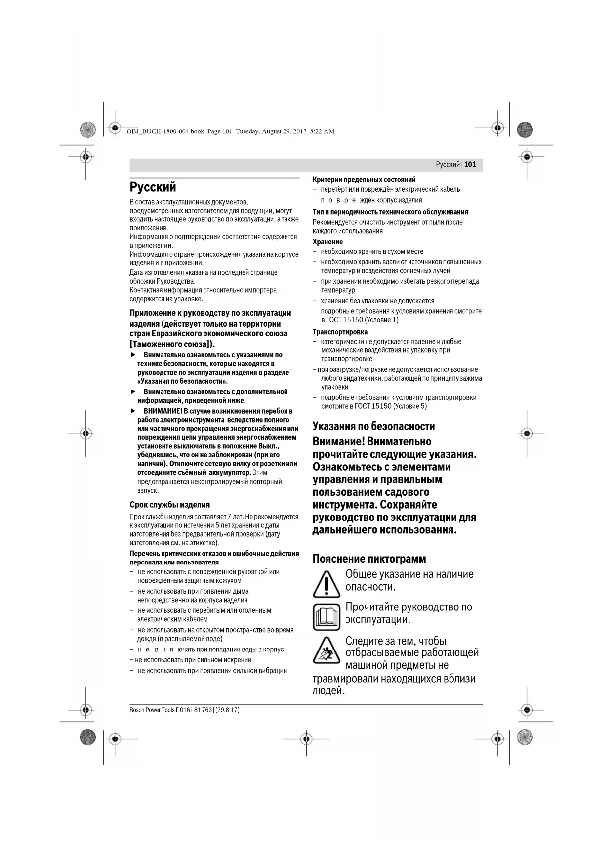 OBJ_BUCH-1800-004.book Page 101 Tuesday, August 29, 2017 8:22 AM102 | Русский F 016 L81 763 | (29.8.17) Bosch Power Tools Предупреждение: Выдерживайте безопасное расстояние до садового инструмента, когда он работает. Выключайте триммер и вытаскивайте штепсельную вилку из розетки перед изменением настроек на триммере или его очисткой, если запутался шнур питания или если Вам нужно оставить триммер без присмотра даже на короткое время. Не допускайте попадания шнура под леску. Обязательно надевайте средства защиты органов слуха и защитные очки. Не работайте в дождь и не оставляйте триммер в дождь