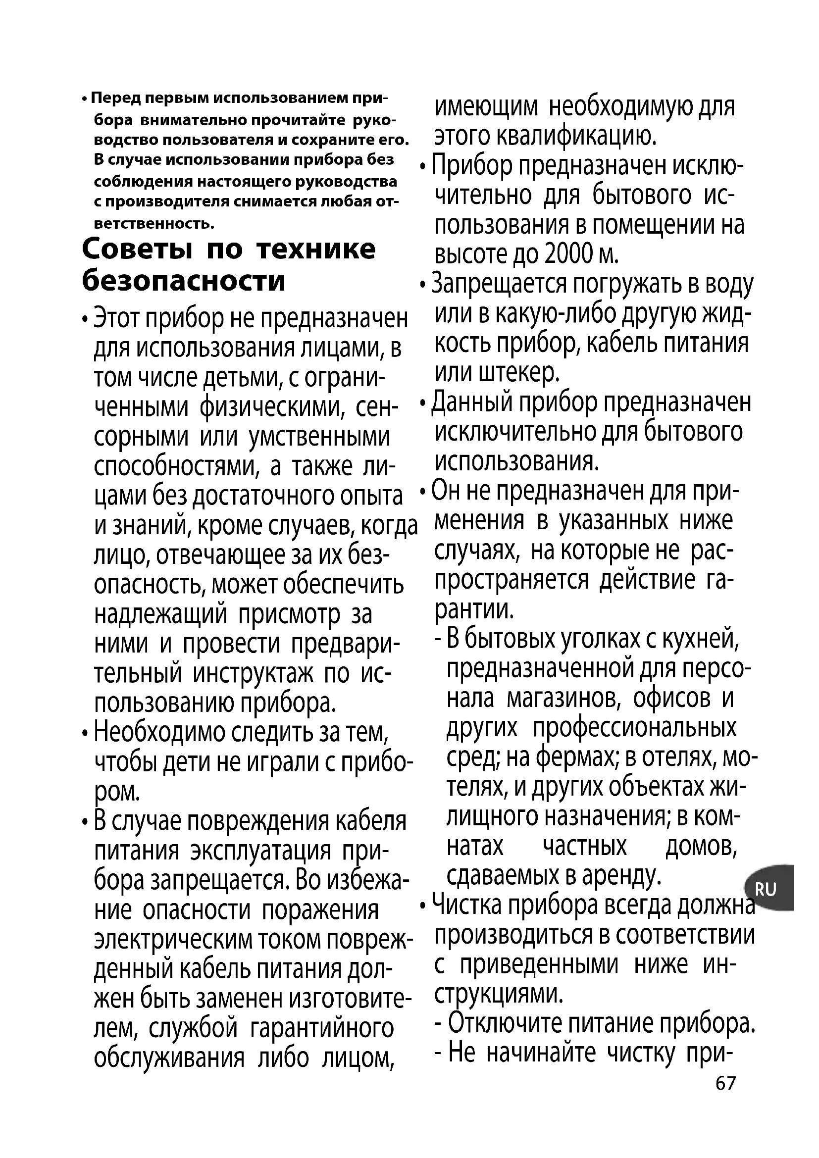 - Этот прибор не предназначен для использования лицами, в том числе детьми, с ограни- ченными физическими, сен- сорными или умственными способностями, а также ли- цами без достаточного опыта и знаний, кроме случаев, когда лицо, отвечающее за их без- опасность, может обеспечить надлежащий присмотр за ними и провести предвари- тельный инструктаж по ис- пользованию прибора.