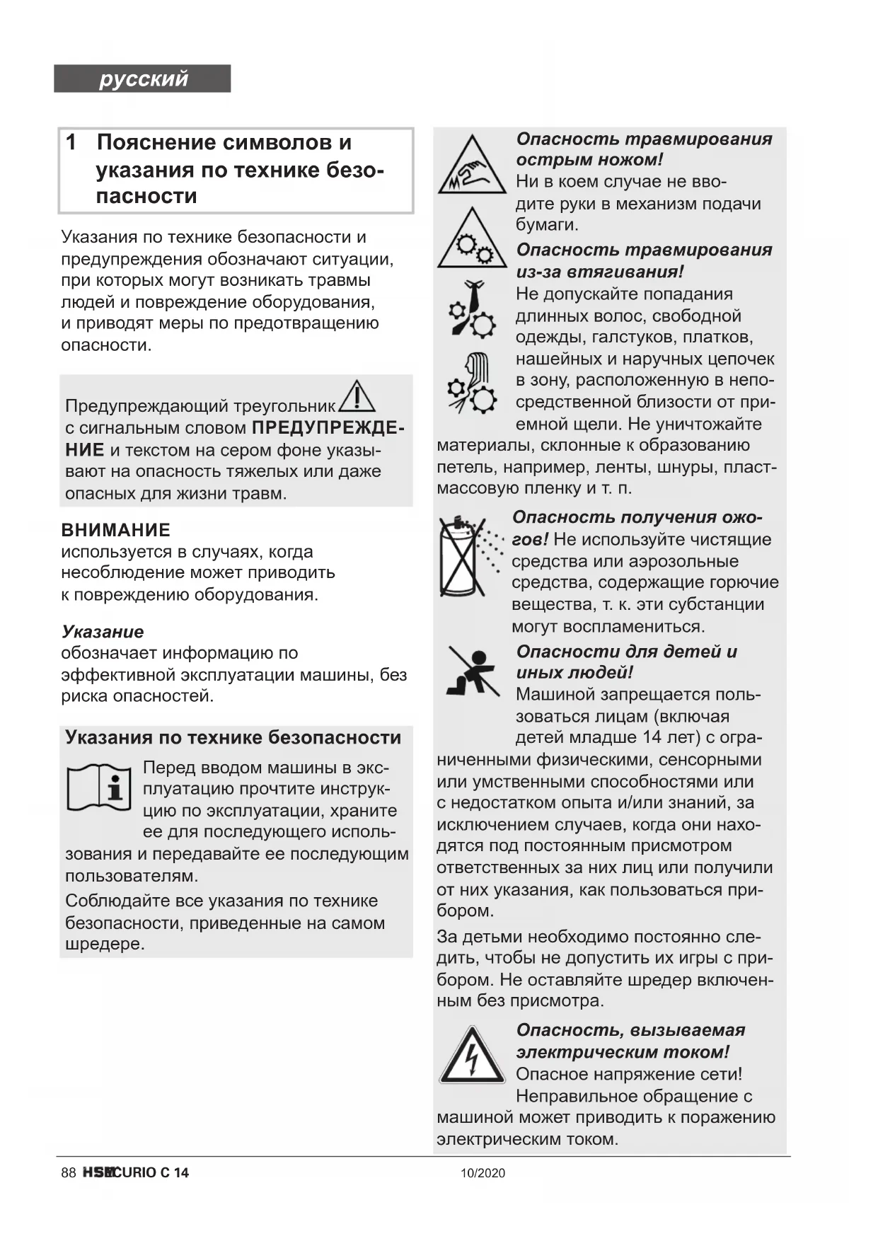 Неправильное обращение с машиной может приводить к поражению электри- ческим током. Перед сменой местоположения или очисткой выключить шредер и вытащить штепсель из розетки. Сервисные работы, связанные со снятием крышек корпуса, разрешается выполнять только службе технического обеспече- ния HSM или сервис-техникам наших авторизованных партнеров. Адреса сервисных центров см. стр.