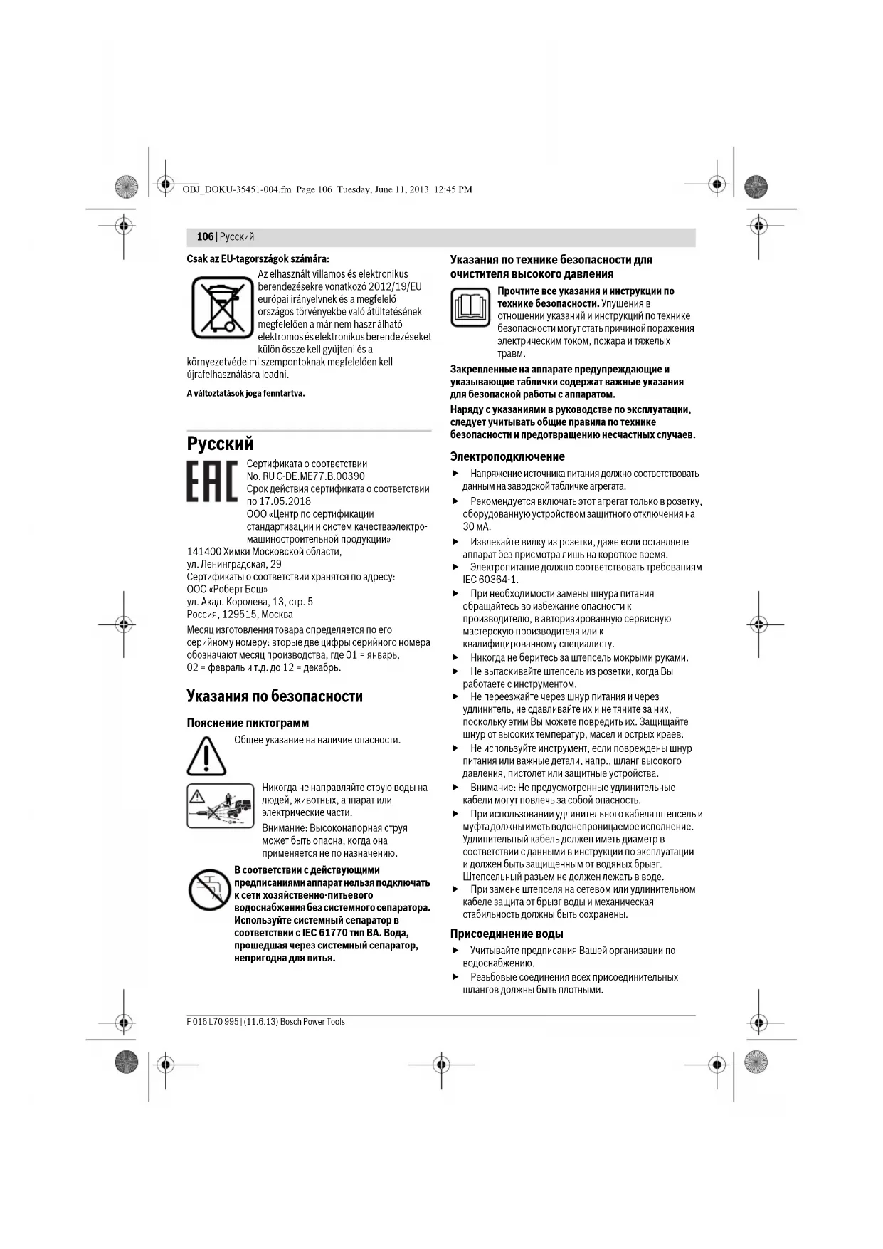 Сертификата о соответствии No. RU C-DE.ME77.B.00390 Срок действия сертификата о соответствии по 17.05.2018 ООО «Центр по сертификации стандартизации и систем качестваэлектро- машиностроительной продукции» 141400 Химки Московской области, ул. Ленинградская, 29 Сертификаты о соответствии хранятся по адресу: ООО «Роберт Бош» ул. Акад. Королева, 13, стр. 5 Россия, 129515, Москва Месяц изготовления товара определяется по его серийному номеру: вторые две цифры серийного номера обозначают месяц производства, где 01 = январь, 02 = февраль и т.д. до 12 = декабрь. Указания по безопасности Пояснение пиктограмм Общее указание на наличие опасности. Никогда не направляйте струю воды на людей, животных, аппарат или электрические части. Внимание: Высоконапорная струя может быть опасна, когда она применяется не по назначению. В соответствии с действующими предписаниями аппарат нельзя подключать к сети хозяйственно-питьевого водоснабжения без системного сепаратора. Используйте системный сепаратор в соответствии с IEC 61770 тип BA. Вода, прошедшая через системный сепаратор, непригодна для питья. Указания по технике безопасности для очистителя высокого давления Прочтите все указания и инструкции по технике безопасности. Упущения в отношении указаний и инструкций по технике безопасности могут стать причиной поражения электрическим током, пожара и тяжелых