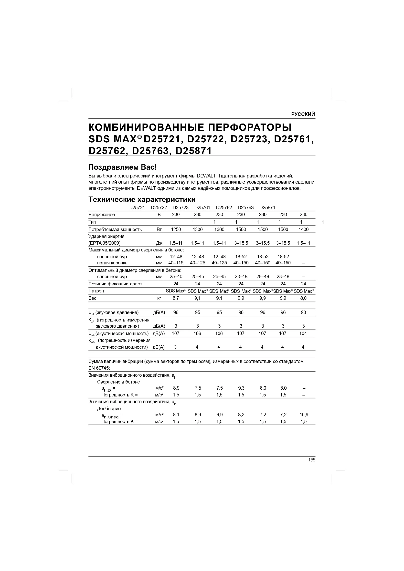D25721, D25722, D25723, D25761, D25762, D25763, D25871 PУССКИЙ 155Уровень вибрации, указанный в данном информационном листке, был рассчитан по стандартному методу тестирования в соответствии со стандартом EN60745 и может использоваться для сравнения инструментов разных марок. Он может также использоваться для предварительной оценки воздействия
