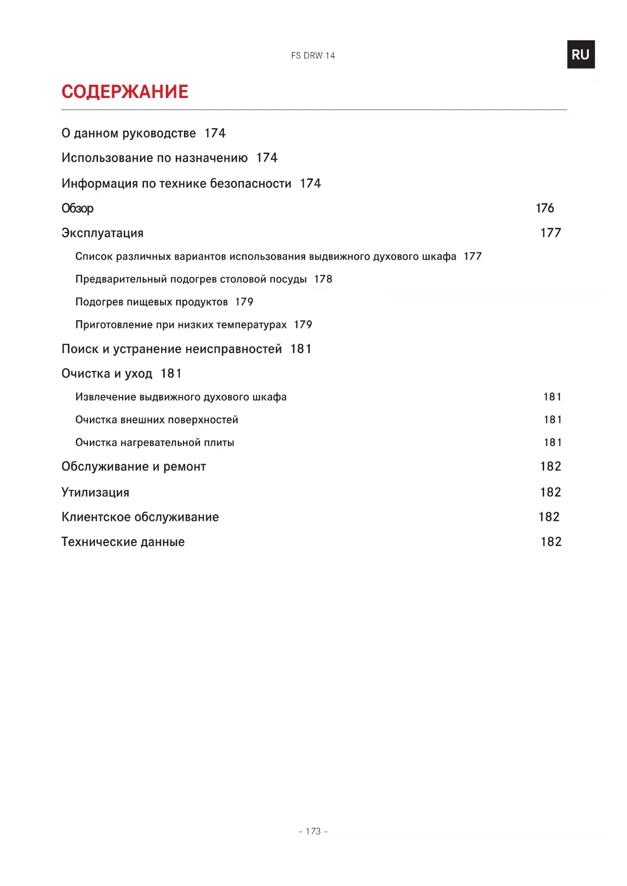 О данном руководстве 174 Использование по назначению 174 Информация по технике безопасности 174 Обзор 176 Эксплуатация 177 Список различных вариантов использования выдвижного духового шкафа 177 Предварительный подогрев столовой посуды 178 Подогрев пищевых продуктов 179 Приготовление при низких температурах 179 Поиск и устранение неисправностей 181 Очистка и уход 181 Извлечение выдвижного духового шкафа 181 Очистка внешних поверхностей 181 Очистка нагревательной плиты 181 Обслуживание и ремонт 182 Утилизация 182 Клиентское обслуживание 182 Технические данные 182FS DRW 14 – 174 –