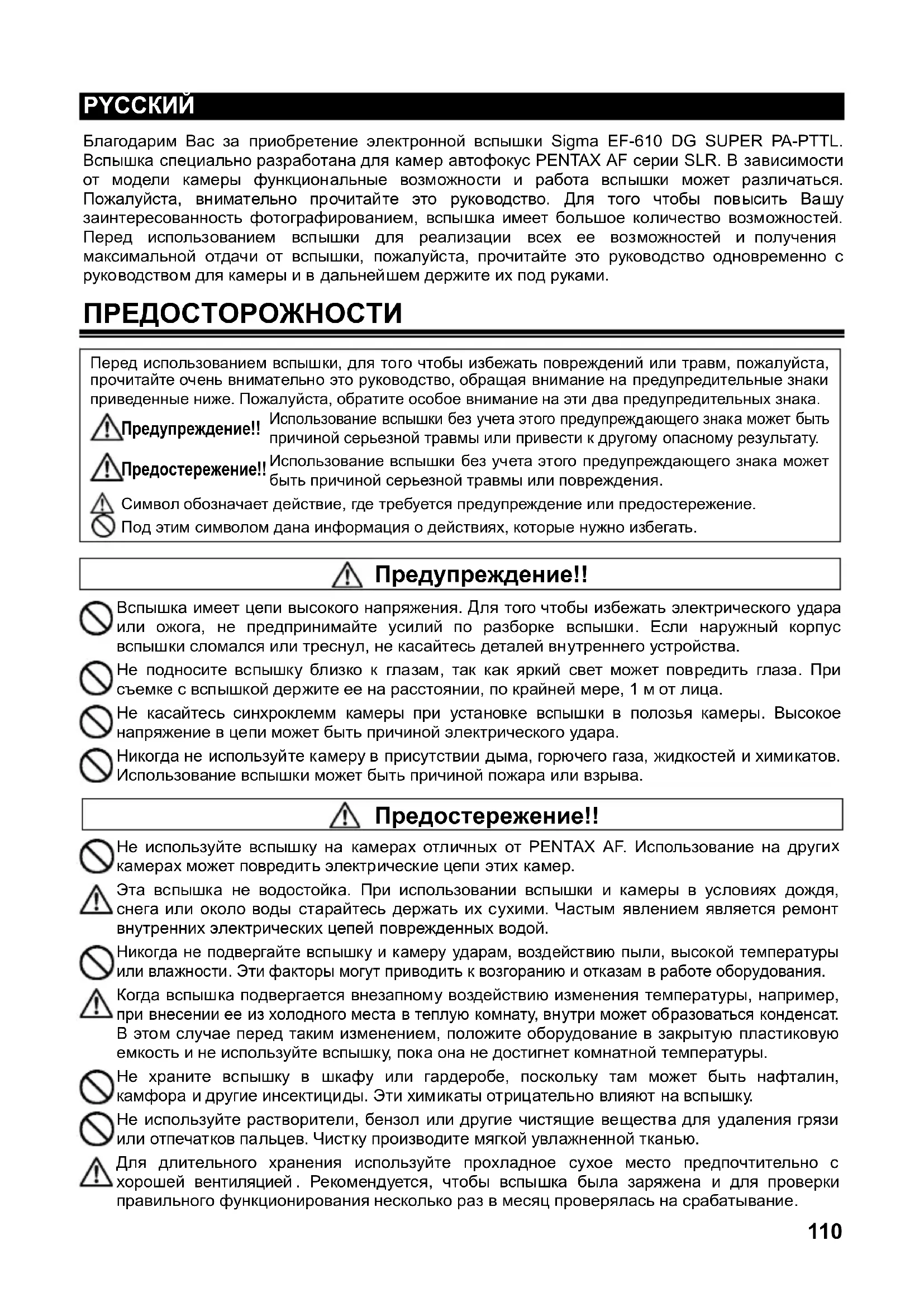 무 게 : 330g. 크 기 : 77mm(W) x 139mm x 117mm110 PYCCКИЙ Благодарим Вас за приобретение электронной вспышки Sigma EF-610 DG SUPER PA-PTTL. Вспышка специально разработана для камер автофокус PENTAX AF серии SLR. В зависимости от модели камеры функциональные возможности и работа вспышки может различаться. Пожалуйста, внимательно прочитайте это руководство. Для того чтобы повысить Вашу заинтересованность фотографированием, вспышка имеет большое количество возможностей. Перед использованием вспышки для реализации всех ее возможностей и получения максимальной отдачи от вспышки, пожалуйста, прочитайте это руководство одновременно с руководством для камеры и в дальнейшем держите их под руками. ПРЕДОСТОРОЖНОСТИ Перед использованием вспышки, для того чтобы избежать повреждений или травм, пожалуйста, прочитайте очень внимательно это руководство, обращая внимание на предупредительные знаки приведенные ниже. Пожалуйста, обратите особое внимание на эти два предупредительных знака.