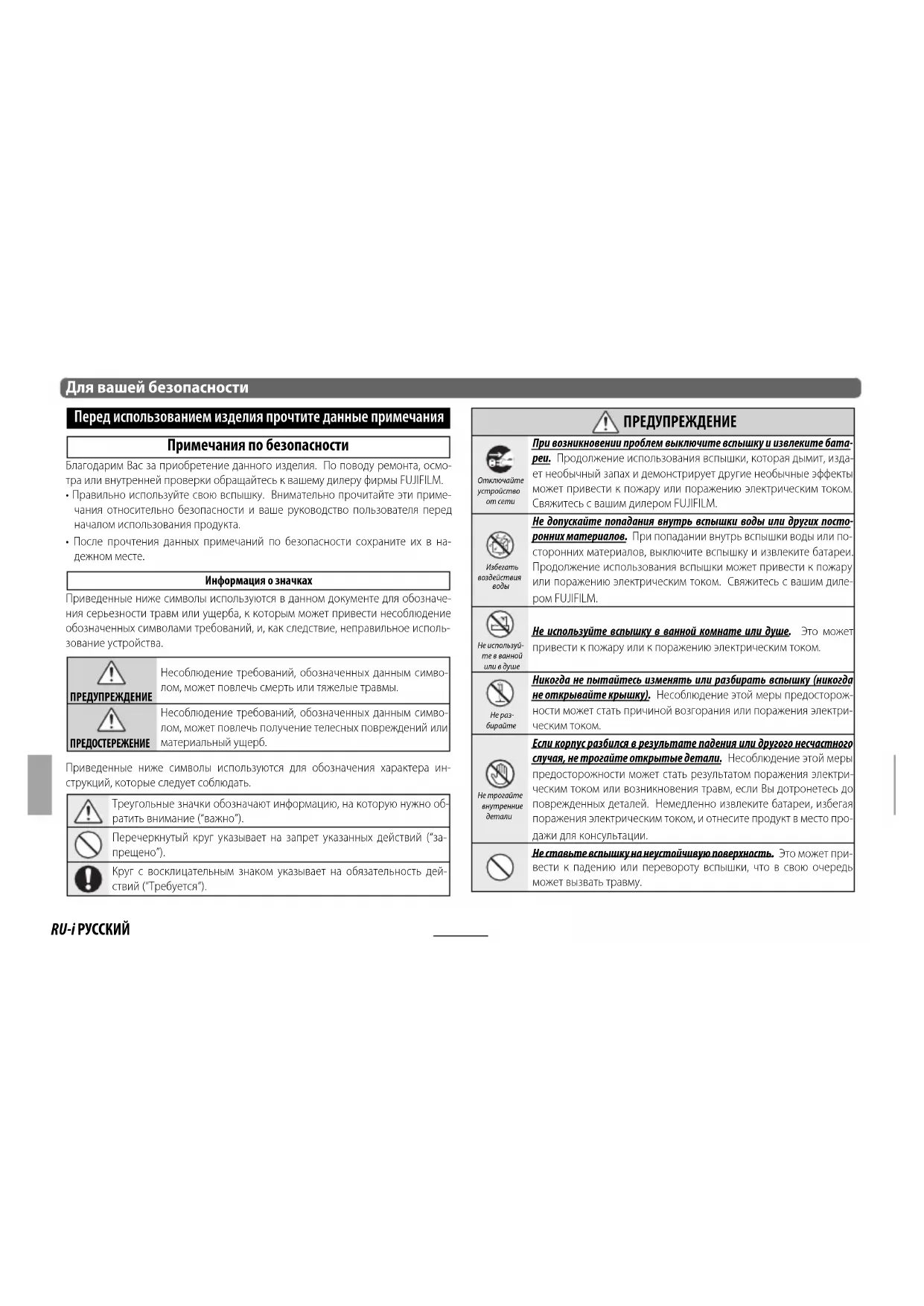 ПРЕДОСТЕРЕЖЕНИЕ ПРЕДОСТЕРЕЖЕНИЕ Не ставьте на вспышку тяжелые объекты. Это может привести к падению или перевороту объекта, что в свою очередь может вы- звать травму. Не закрывайте и не заворачивайте вспышку или зарядное устрой- ство в ткань или одежду. Это может привести к перегреву и де- формации корпуса, а также к пожару. Извлеките батареи при очистке вспышки или перед ее длительным хранением. Если этого не сделать, то может произойти утечка электролита, пожар или поражение электрическим током. Использование вспышки при съемке людей с близкого расстояния мо- жет временно нарушить их зрение. Будьте особенно внимательны при съемке детей и младенцев. Необходимо регулярно проводить внутреннюю проверку и очистку вспышки. Накопление пыли внутри вспышки может привести к пожару или поражению электрическим током. Для регулярной очистки каждые два года обратитесь к вашему дилеру FUJIFILM. Имейте в виду, что эта услуга платная. Не используйте для очистки вспышки спирт, растворитель, бензин и другие летучие органические растворители. Это может привести к пожару или поражению электрическим током.RU-iii РУССКИЙ