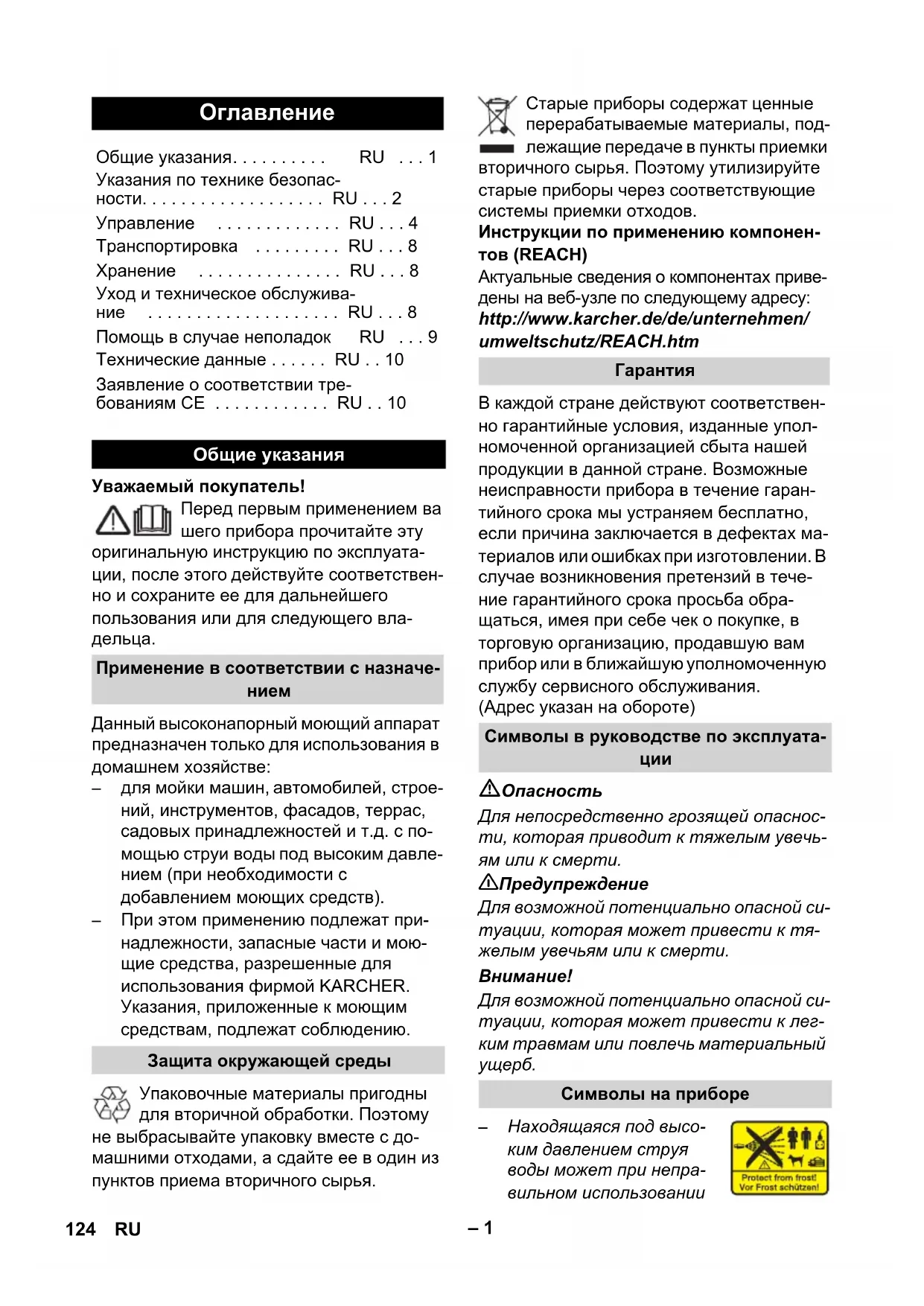 Символы на приборе 124 RU– 2 представлять опасность. Запреща- ется направлять струю воды на лю дей, животных, включенное электри- ческое оборудование или на сам высо- конапорный моющий аппарат. – Мороз может вызвать повреждения не полностью опорожненного прибора. Храните прибор зимой в помещении, защищенном от мороза.