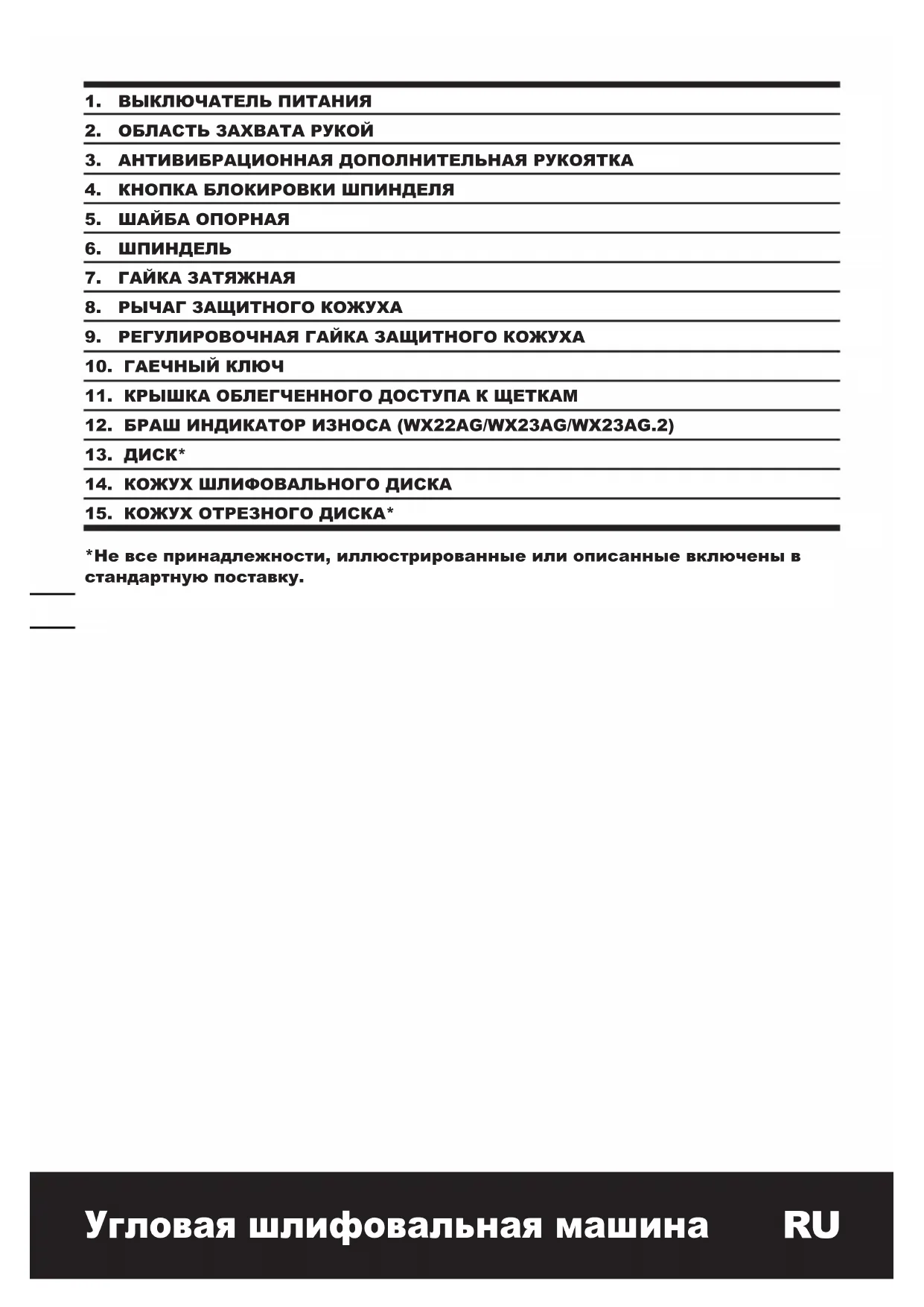C . Распределите задачи так, чтобы работы, сопровождающиеся высоким уровнем вибрации, проводились через большие промежутки времени. ПРИНАДЛЕЖНОСТИ Гаечный ключ 1 Антивибрационная дополнительная рукоятка 1 Шлифовальный круг по металлу (WX22AG WX23AG WX23AG.1) 1 Рекомендуется приобретать все принадлежности в том же магазине, где был приобретен инструмент. Используйте качественные принадлежности с указанием общеизвестной торговой марки. За более подробной информацией обратитесь к разделу «Рекомендации по использованию перфоратора» в этой инструкции или сведениям на упаковке принадлежностей. Помощь и консультацию можно также получить у продавца.Угловая шлифовальная машина