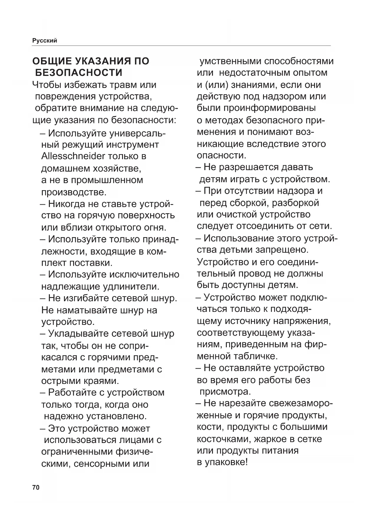 Simbol Explicație Marcaj CE: Produsul corespunde cerințelor aplicabile ale Uniunii Europene. Produsul a intrat pe piață după data de 13 august 2005. Nu este permisă eliminarea împreună cu gunoiul menajer. Simbolul cu coș de gunoi tăiat indică necesitatea colectării separate. Adecvat pentru contactul cu alimentele Aparat cu grad de protecție II70 ОБЩИЕ УКАЗАНИЯ ПО БЕЗОПАСНОСТИ Чтобы избежать травм или повреждения устройства, обратите внимание на следую- щие указания по безопасности: – Используйте универсаль- ный режущий инструмент Allesschneider только в домашнем хозяйстве, а не в промышленном производстве. – Никогда не ставьте устрой- ство на горячую поверхность или вблизи открытого огня. – Используйте только принад- лежности, входящие в ком- плект поставки. – Используйте исключительно надлежащие удлинители. – Не изгибайте сетевой шнур. Не наматывайте шнур на устройство. – Укладывайте сетевой шнур так, чтобы он не сопри- касался с горячими пред- метами или предметами с острыми краями. – Работайте с устройством только тогда, когда оно надежно установлено. – Это устройство может использоваться лицами с ограниченными физиче- скими, сенсорными или умственными способностями или недостаточным опытом и (или) знаниями, если они действую под надзором или были проинформированы о методах безопасного при- менения и понимают воз- никающие вследствие этого