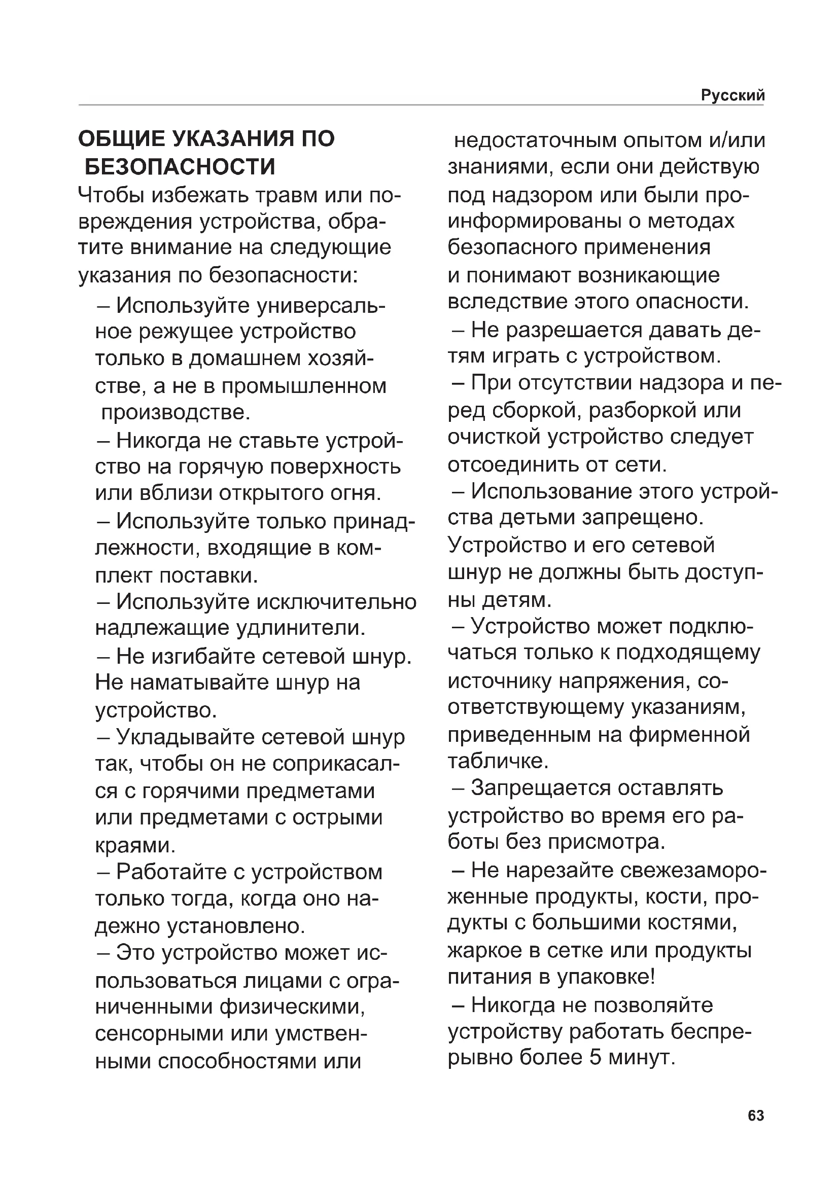 ОБЩИЕ УКАЗАНИЯ ПО БЕЗОПАСНОСТИ Чтобы избежать травм или по- вреждения устройства, обра- тите внимание на следующие указания по безопасности: – Используйте универсаль- ное режущее устройство только в домашнем хозяй- стве, а не в промышленном производстве. – Никогда не ставьте устрой- ство на горячую поверхность или вблизи открытого огня. – Используйте только принад- лежности, входящие в ком- плект поставки. – Используйте исключительно надлежащие удлинители. – Не изгибайте сетевой шнур. Не наматывайте шнур на устройство. – Укладывайте сетевой шнур так, чтобы он не соприкасал- ся с горячими предметами или предметами с острыми