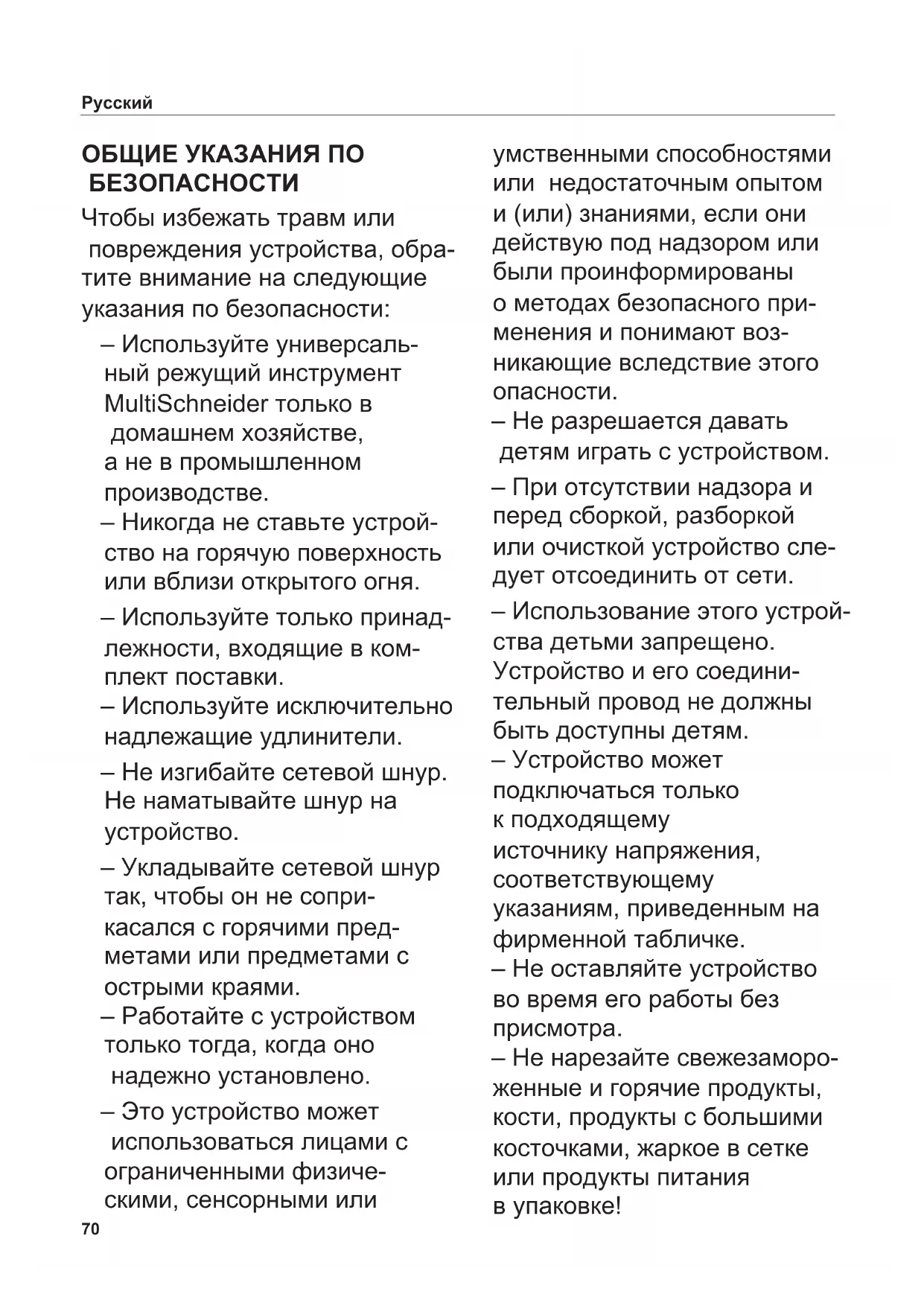 ОБЩИЕ УКАЗАНИЯ ПО БЕЗОПАСНОСТИ Чтобы избежать травм или повреждения устройства, обра- тите внимание на следующие указания по безопасности: – Используйте универсаль- ный режущий инструмент MultiSchneider только в домашнем хозяйстве, а не в промышленном производстве. – Никогда не ставьте устрой- ство на горячую поверхность или вблизи открытого огня. – Используйте только принад- лежности, входящие в ком- плект поставки. – Используйте исключительно надлежащие удлинители. – Не изгибайте сетевой шнур. Не наматывайте шнур на устройство. – Укладывайте сетевой шнур так, чтобы он не сопри- касался с горячими пред- метами или предметами с острыми краями. – Работайте с устройством только тогда, когда оно надежно установлено. – Это устройство может использоваться лицами с ограниченными физиче- скими, сенсорными или умственными способностями или недостаточным опытом и (или) знаниями, если они действую под надзором или были проинформированы о методах безопасного при- менения и понимают воз- никающие вследствие этого