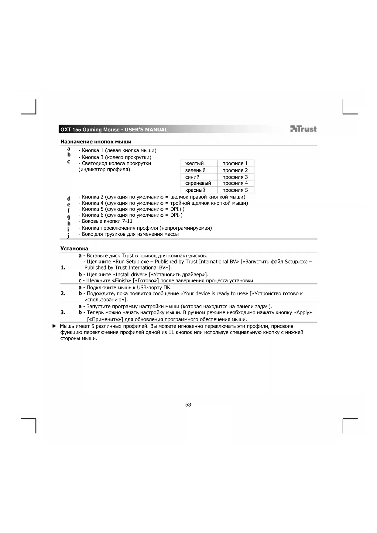 a - Запустите программу настройки мыши (которая находится на панели задач). b - Теперь можно начать настройку мыши. В ручном режиме необходимо нажать кнопку «Apply» [«Применить»] для обновления программного обеспечения мыши. Мышь имеет 5 различных профилей. Вы можете мгновенно переключать эти профили, присвоив функцию переключения профилей одной из 11 кнопок или используя специальную кнопку с нижней стороны мыши.GXT 155 Gaming Mouse - USER’S MANUAL
