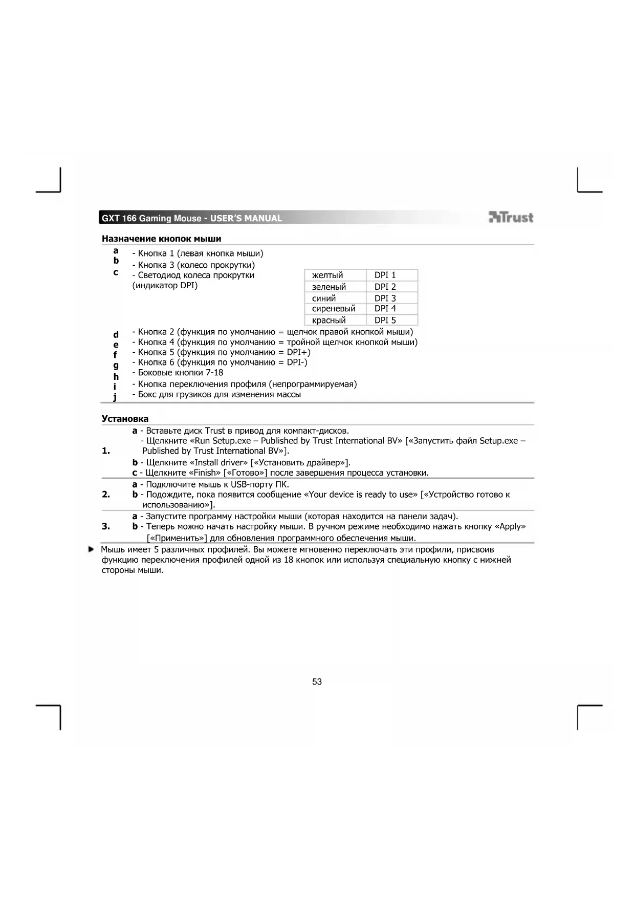 a - Запустите программу настройки мыши (которая находится на панели задач). b - Теперь можно начать настройку мыши. В ручном режиме необходимо нажать кнопку «Apply» [«Применить»] для обновления программного обеспечения мыши. Мышь имеет 5 различных профилей. Вы можете мгновенно переключать эти профили, присвоив функцию переключения профилей одной из 18 кнопок или используя специальную кнопку с нижней стороны мыши.GXT 166 Gaming Mouse - USER’S MANUAL