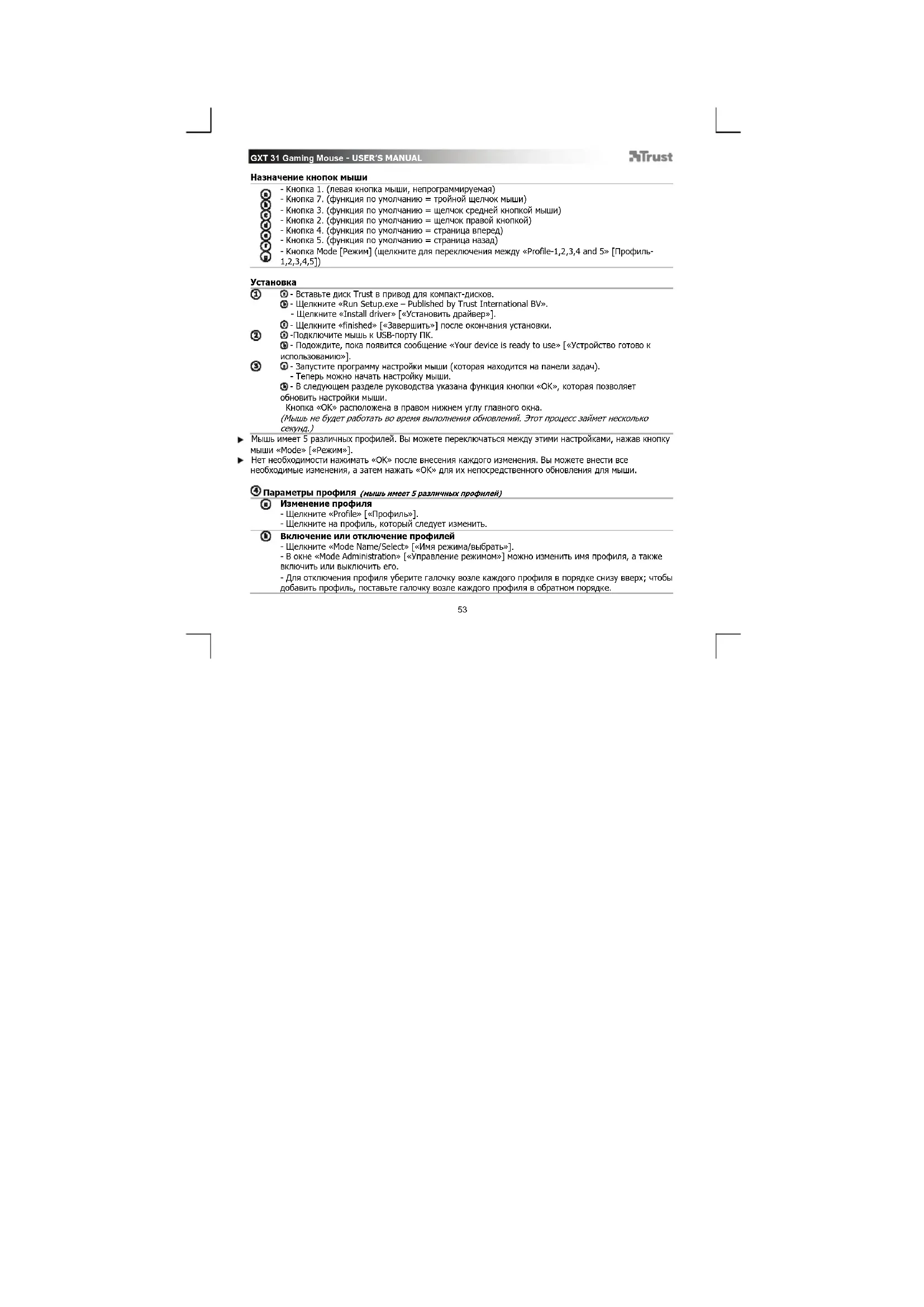 - Вставьте диск Trust в привод для компакт-дисков. - Щелкните «Run Setup.exe – Published by Trust International BV». - Щелкните «Install driver» [«Установить драйвер»]. - Щелкните «finished» [«Завершить»] после окончания установки. -Подключите мышь к USB-порту ПК. - Подождите, пока появится сообщение «Your device is ready to use» [«Устройство готово к использованию»]. - Запустите программу настройки мыши (которая находится на панели задач). - Теперь можно начать настройку мыши. - В следующем разделе руководства указана функция кнопки «OK», которая позволяет обновить настройки мыши. Кнопка «OK» расположена в правом нижнем углу главного окна. (Мышь не будет работать во время выполнения обновлений. Этот процесс займет несколько