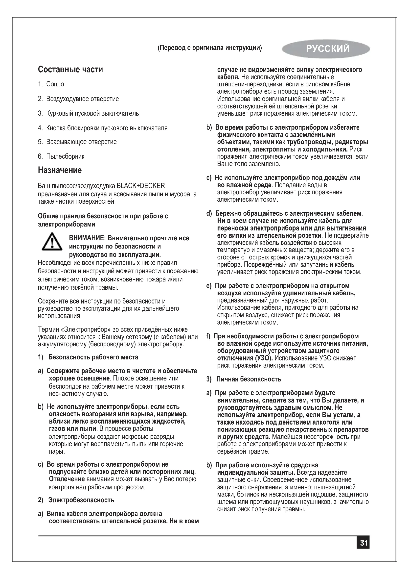 Ваш пылесос/воздуходувка BLACK+DECKER предназначен для сдува и всасывания пыли и мусора, а также чистки поверхностей. Общие правила безопасности при работе с электроприборами ВНИМАНИЕ: Внимательно прочтите все инструкции по безопасности и руководство по эксплуатации. Несоблюдение всех перечисленных ниже правил безопасности и инструкций может привести к поражению электрическим током, возникновению пожара и/или получению тяжёлой травмы. Сохраните все инструкции по безопасности и руководство по эксплуатации для их дальнейшего использования Термин «Электроприбор» во всех приведённых ниже указаниях относится к Вашему сетевому (с кабелем) или аккумуляторному (беспроводному) электроприбору.